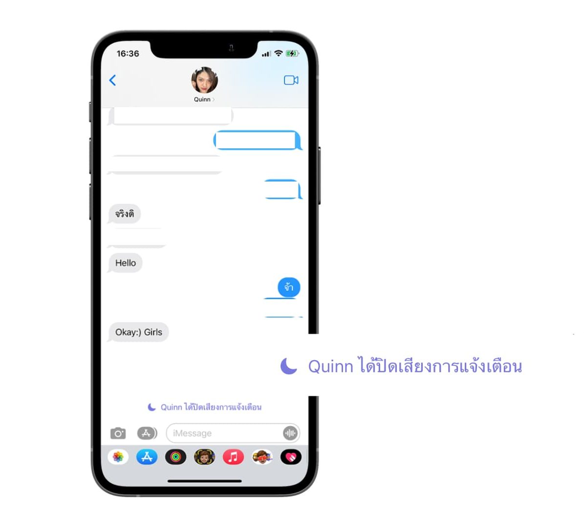 - สถานะแสดงให้ผู้ติดต่อของคุณเห็นในการสนทนาของแอปข้อความซึ่งระบุว่าการแจ้งเตือนของคุณปิดเสียงอยู่ในโหมดโฟกัส