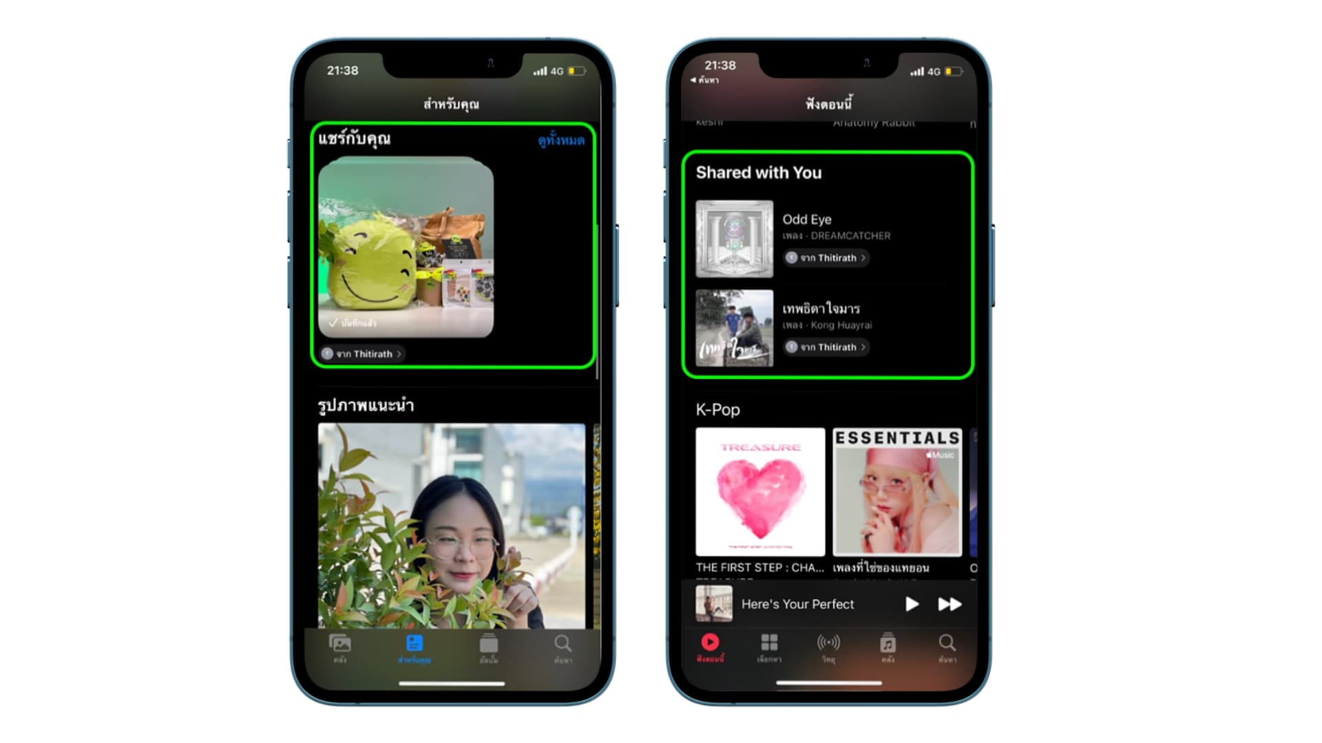 - แชร์กับคุณแสดงเนื้อหาที่เพื่อนส่งให้กับคุณในการสนทนาของแอปข้อความในส่วนใหม่ในแอปรูปภาพ, Safari, Apple News, Apple Music, Apple Podcasts หรือแอป Apple TV