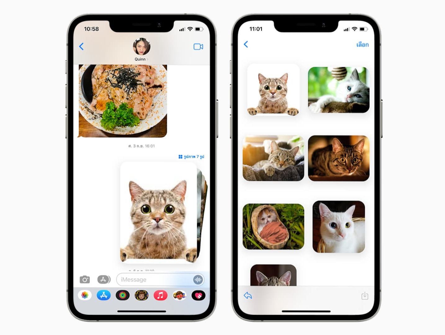 - รูปภาพหลายรูปที่ส่งในแอปข้อความแสดงเป็นภาพเรียงต่อกันที่เลื่อนดูได้แบบเร็วๆ หรือเป็นภาพวางซ้อนกันที่สามารถปัดดูได้