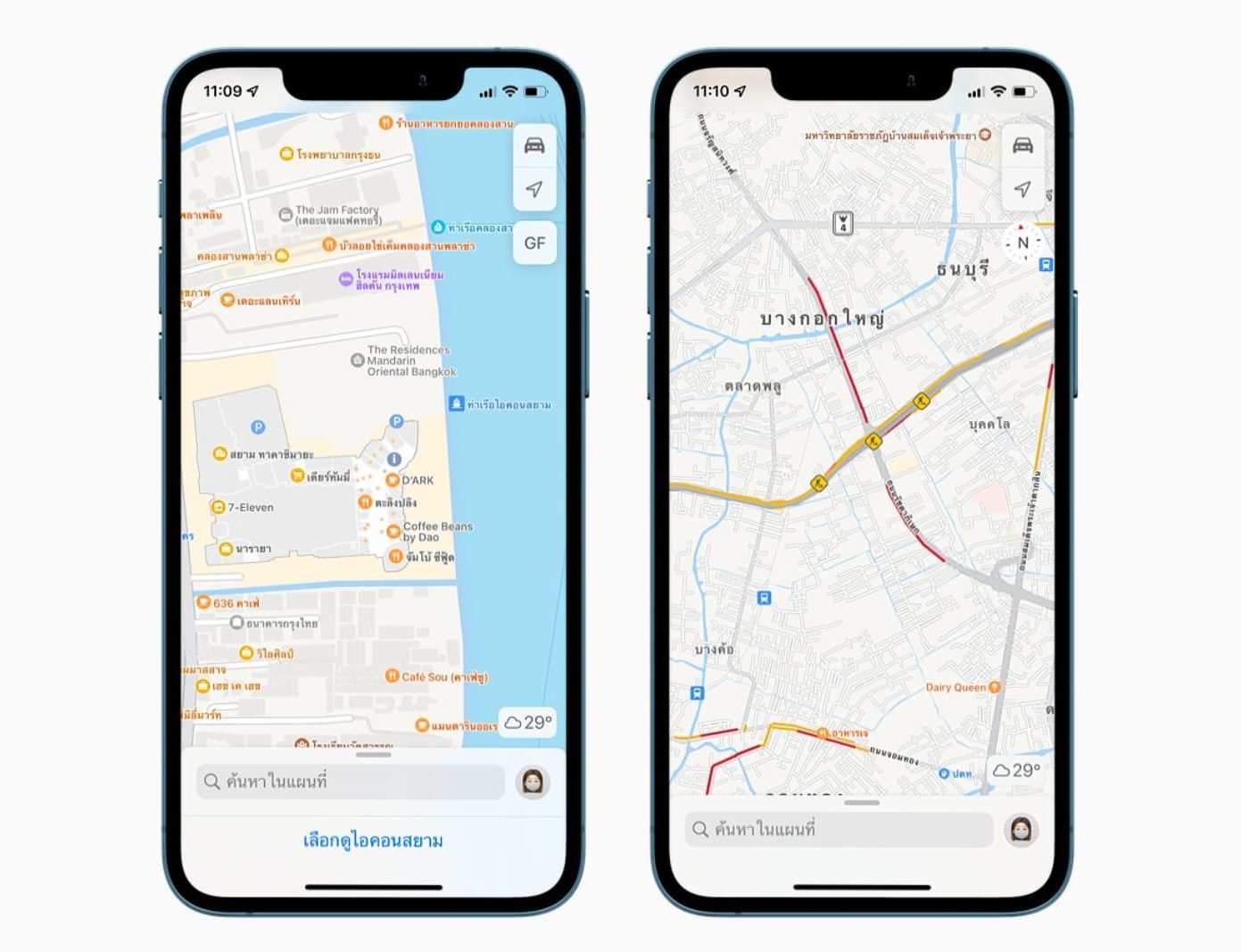 - แผนที่เมืองแบบละเอียดแสดงระดับความสูง ต้นไม้ อาคาร สถานที่สำคัญ ทางม้าลาย และช่องทางเลี้ยว รวมถึงมุมมอง 3D สำหรับนำทางตามทางแยกที่ซับซ้อน และอื่นๆ ในบริเวณอ่าวซานฟรานซิสโก ลอสแองเจลิส นิวยอร์ก และลอนดอน รวมทั้งเมืองอื่นๆ อีกมากมายในอนาคต (iPhone XS, iPhone XS Max, iPhone XR ขึ้นไป)