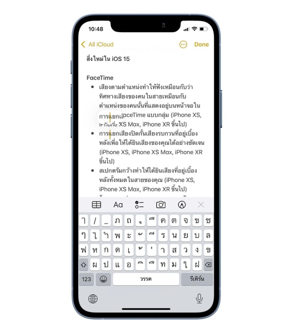 - เสียงตามตำแหน่งทำให้ฟังเหมือนกับว่าทิศทางเสียงของคนในสายเหมือนกับตำแหน่งของคนนั้นที่แสดงอยู่บนหน้าจอในการโทร FaceTime แบบกลุ่ม (iPhone XS, iPhone XS Max, iPhone XR ขึ้นไป)