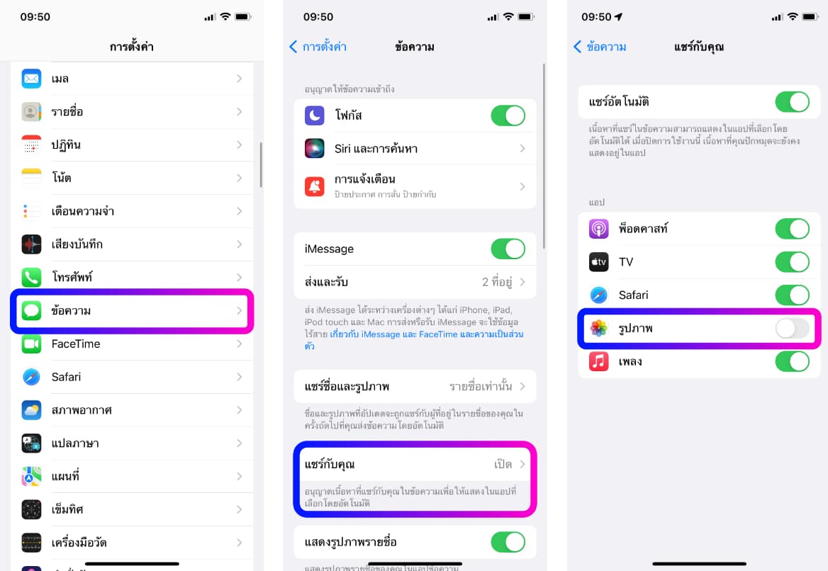 เข้าไปที่ การตั้งค่า > ข้อความ > แชร์กับคุณ > เลือกปิดการแชร์บนแอปรูปภาพ (หรือจะปิดการแชร์อัตโนมัติทั้งหมดก็ได้หากต้องการ)
