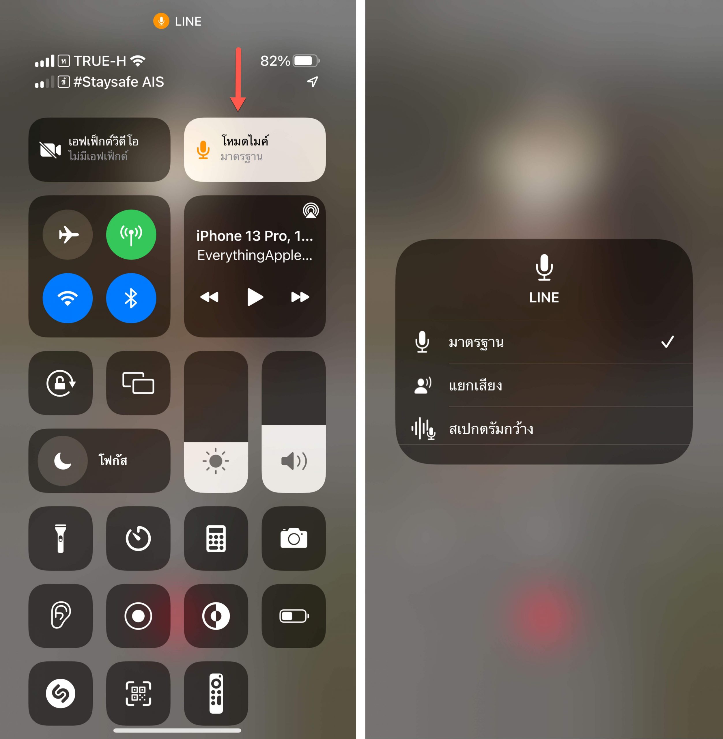 เปิดใช้โดย ในระหว่างการสนทนาด้วย FaceTime หรือแอปอื่น ให้ปัดเรียก Control Center > แตะเลือกโหมดไมค์ตามต้องการ