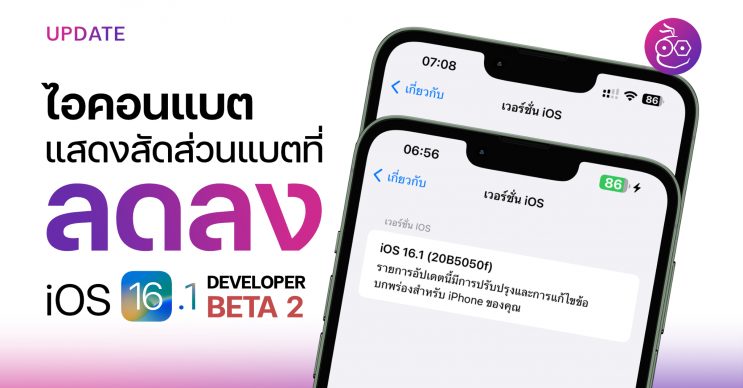 ล่าสุดใน iOS 16.1 Developer Beta 2 ได้มีการปรับปรุงการแสดงผลไอคอนแบตใหม่ โดยจะแสดงสัดส่วนแบตที่ลดลงไป อ้างอิงตามเปอร์เซ็นต์แบตเตอรี่