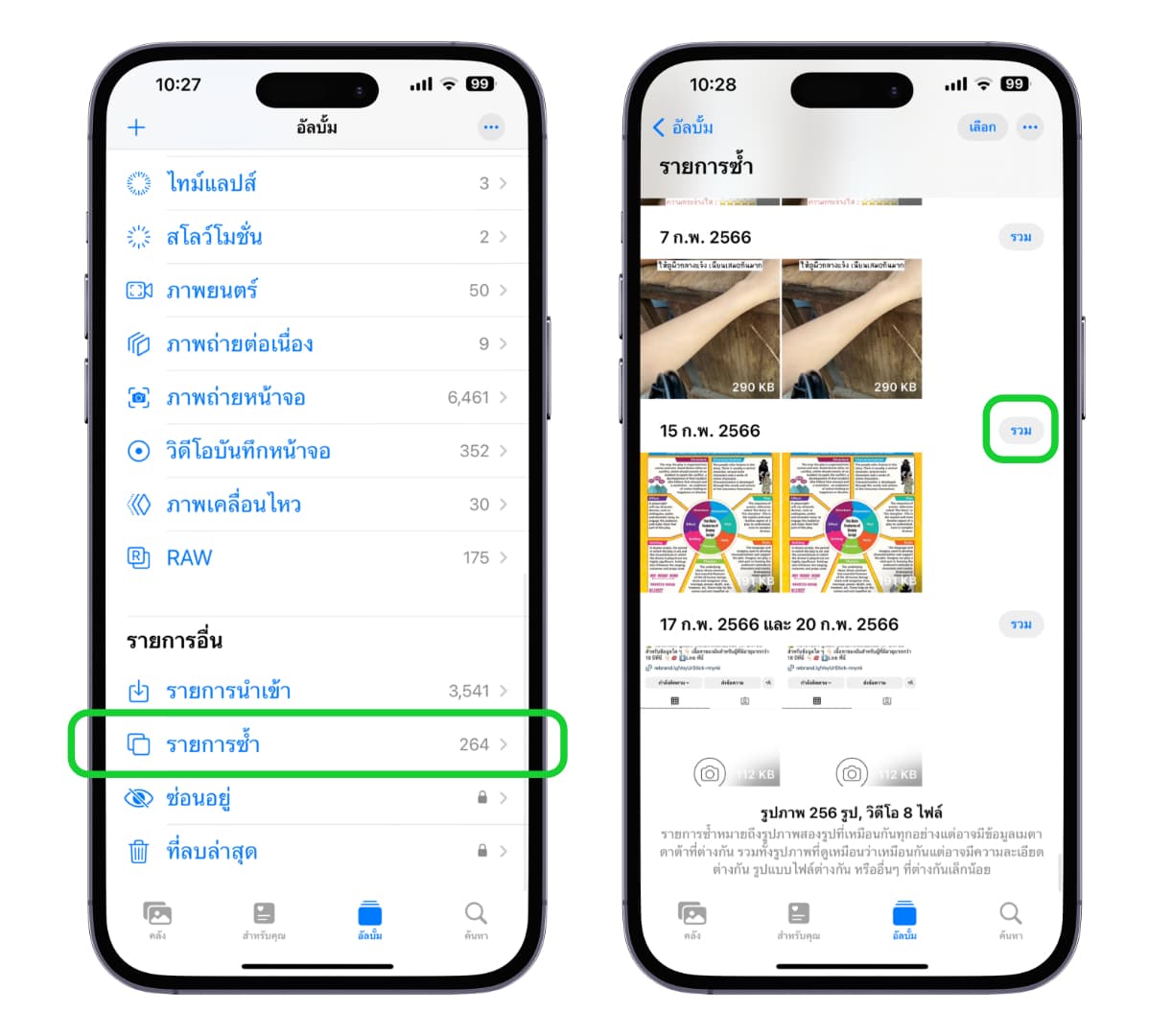 รูปไหนที่ซ้ำกัน ก็กด “รวม” ได้เลย หลังจากนั้นก็จะเหลือเพียงรูปเดียว ไม่รกเครื่องอีกต่อไป!