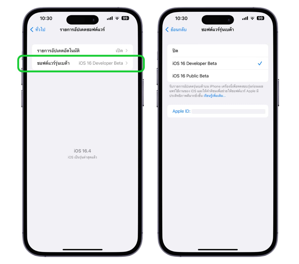 เริ่มตั้งแต่ iOS 16.4 เป็นตั้งไป สมาชิกของโปรแกรมนักพัฒนา Apple (Apple Developer Beta) จะเห็นตัวเลือกการอัปเดตสำหรับนักพัฒนา ซึ่งหากมีการติดตั้งโปรไฟล์ Public Beta ไว้ด้วย ก็จะสามารถเลือกได้ว่าจะอัปเดต Public Beta หรือ Developer Beta