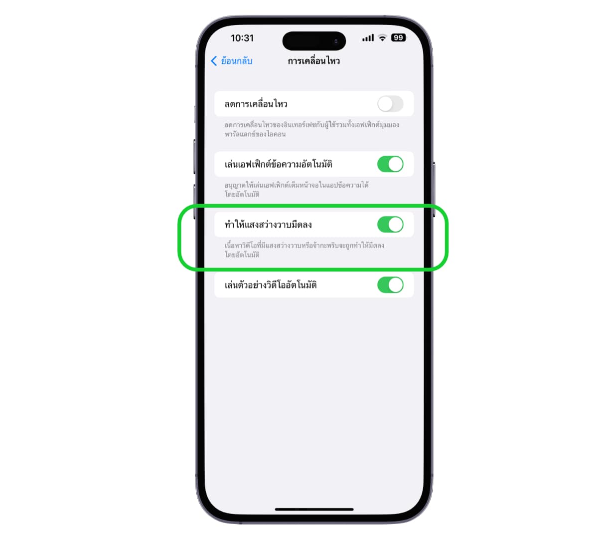 เปิดการตั้งค่าได้โดย ไปที่ การตั้งค่า > การช่วยการเข้าถึง > การเคลื่อนไหว > เปิด “ทำให้แสงสว่างวาบมืดลง”