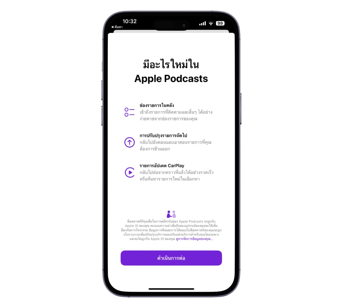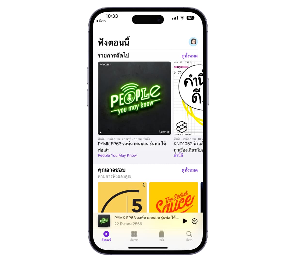 แอป Podcasts ถูกปรับปรุงให้เราเข้าไปดูชาแนลที่เรากดติดตามไว้ง่ายขึ้น หรือ กดเล่นจากเรื่องที่เราฟังไม่จบเพื่อกลับไปฟังต่อได้ง่าย ที่แท็ป “รายการถัดไป” ซึ่งจะอยู่ด้านบนสุด