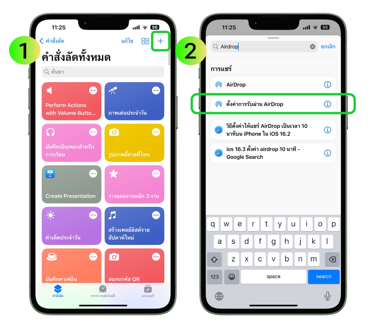 1.เข้าไปที่แอปคำสั่งลัดบน iPhone > แตะเครื่องหมาย + > พิมพ์ค้นหาคำว่า “AirDrop” ที่เมนูค้นหาด้านล่าง > เลือก “ตั้งค่าการรับผ่าน AirDrop”