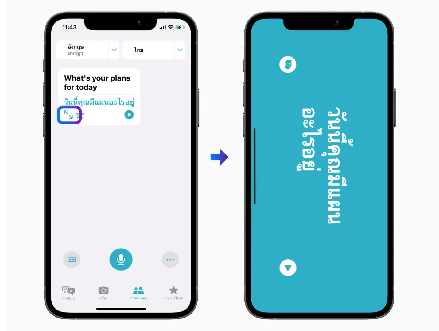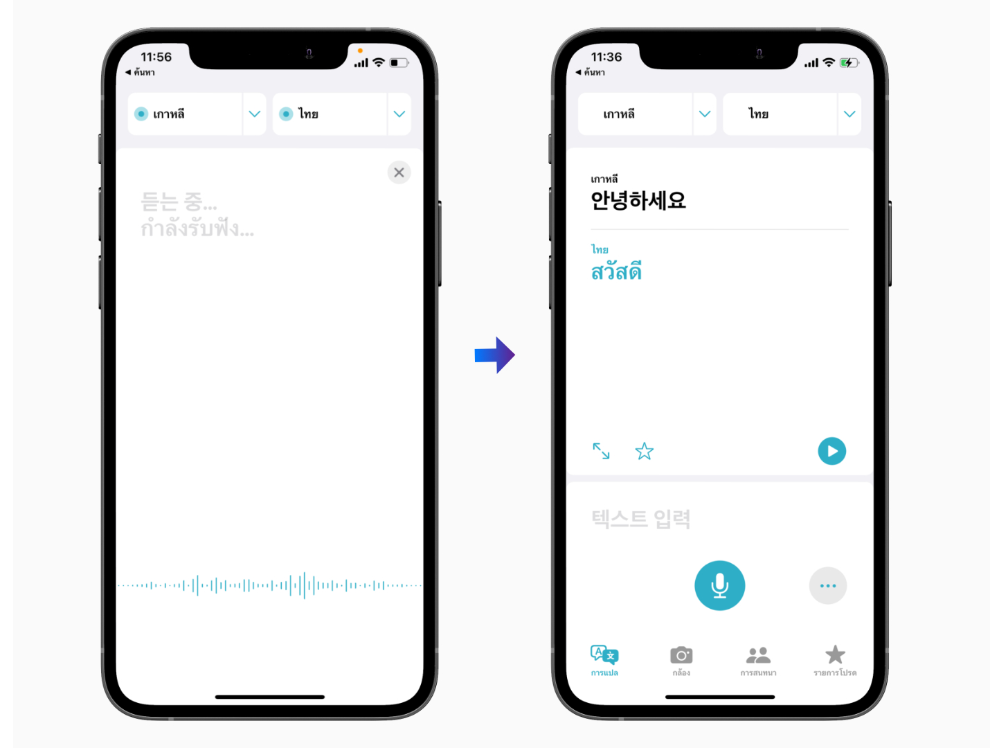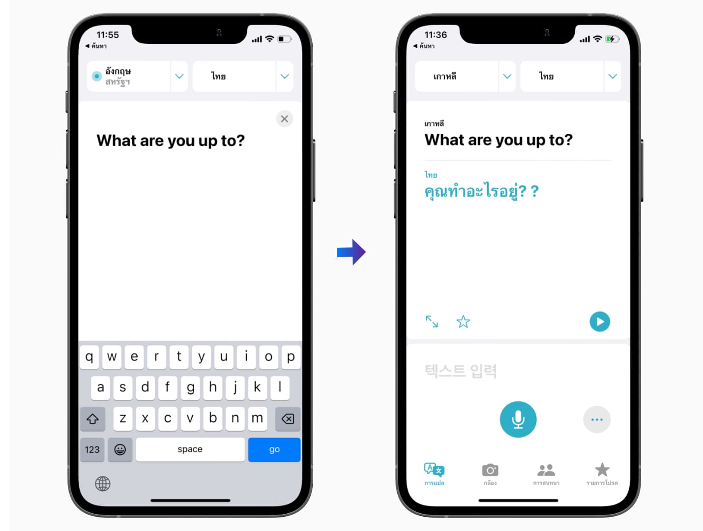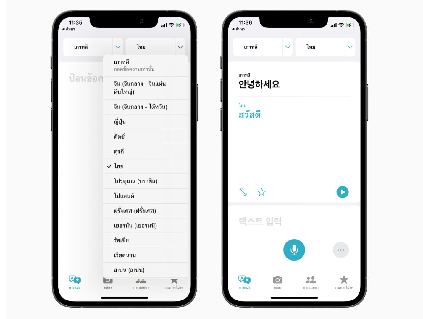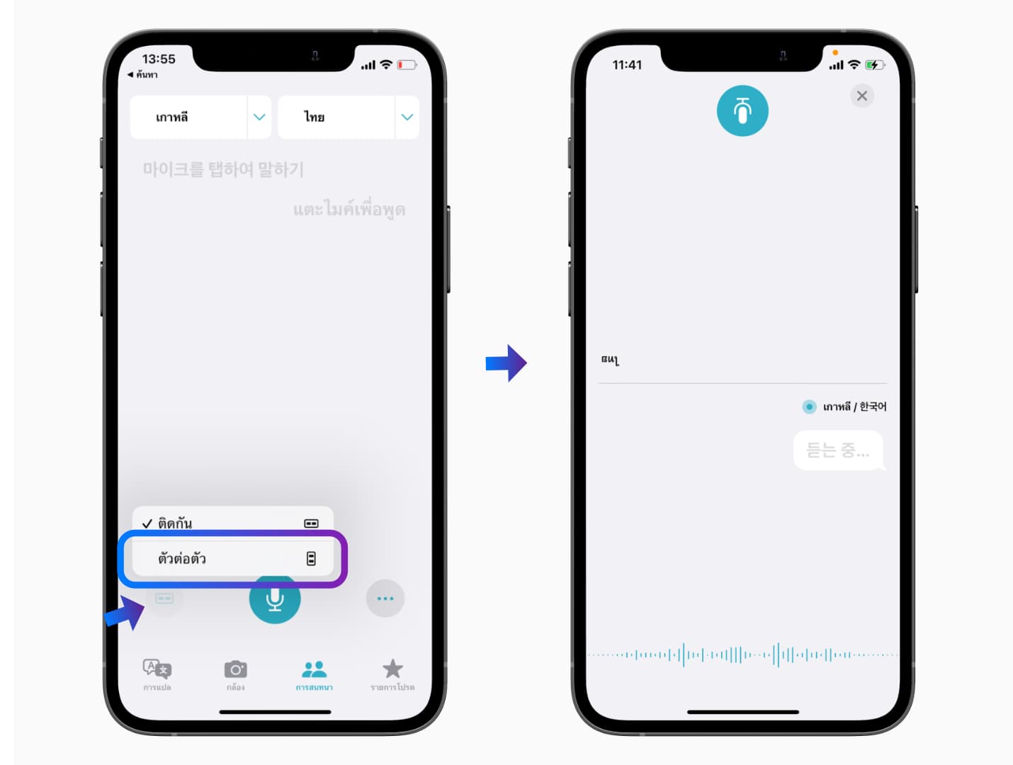 สามารถเลือกใช้การแปล “ตัวต่อตัว” เพื่อแปลบทสนทนากับคู่สนทนา เพียงกดปุ่มไมค์โครโฟนค้างไว้