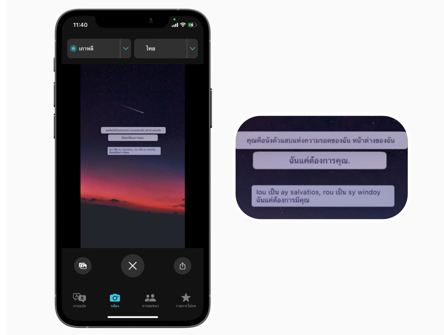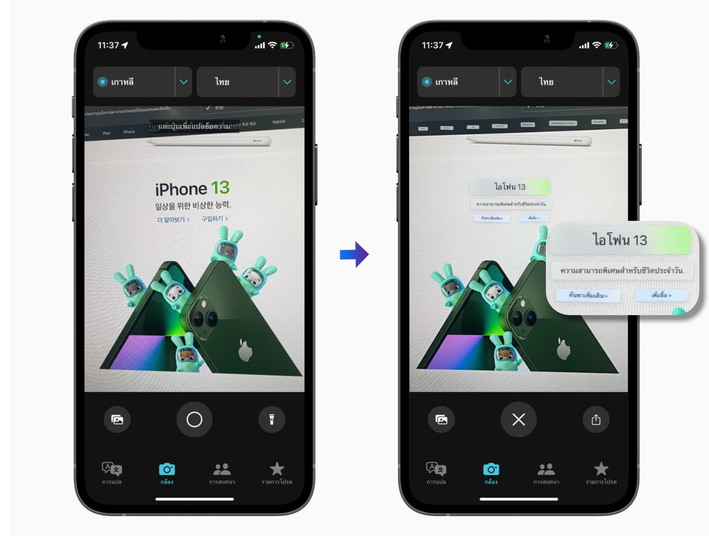 เลือกที่เมนู “กล้อง” จากนั้นกดถ่ายภาพเพื่อแปลภาษา เมื่อกดถ่ายก็จะมีการแปลภาษาให้ทันที ตามภาษาที่เราเลือกไว้