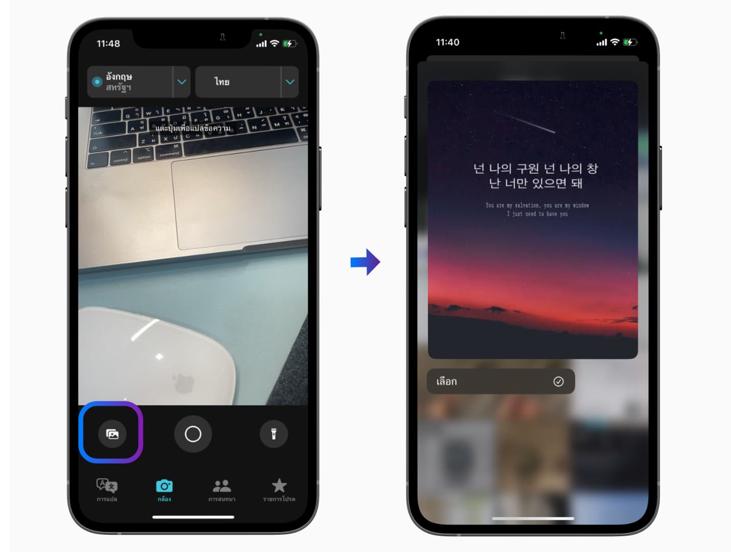 แตะเมนูที่อัลบั้มรูปภาพ จากนั้นเลือกรูปภาพที่ต้องการแปลภาษา