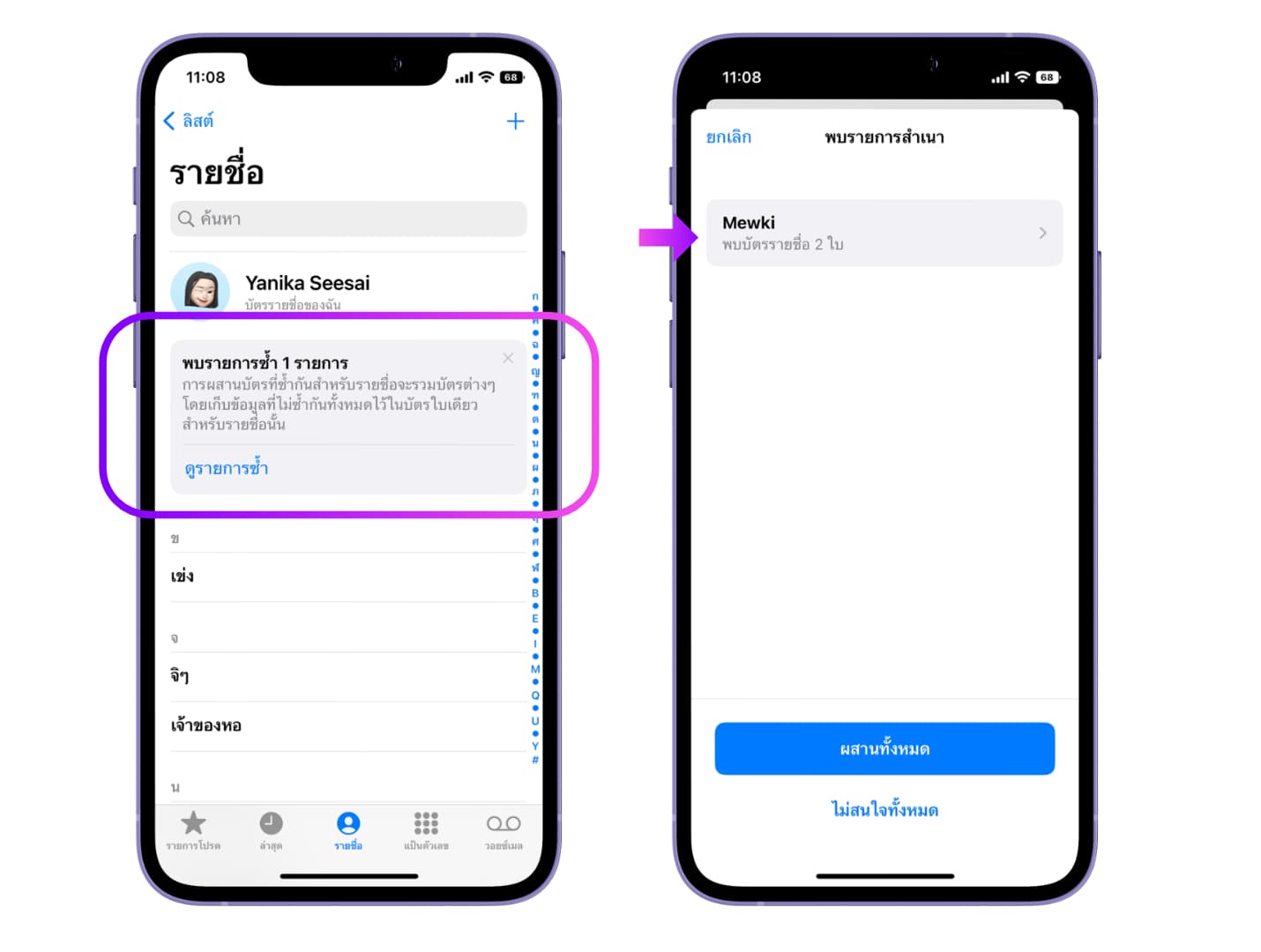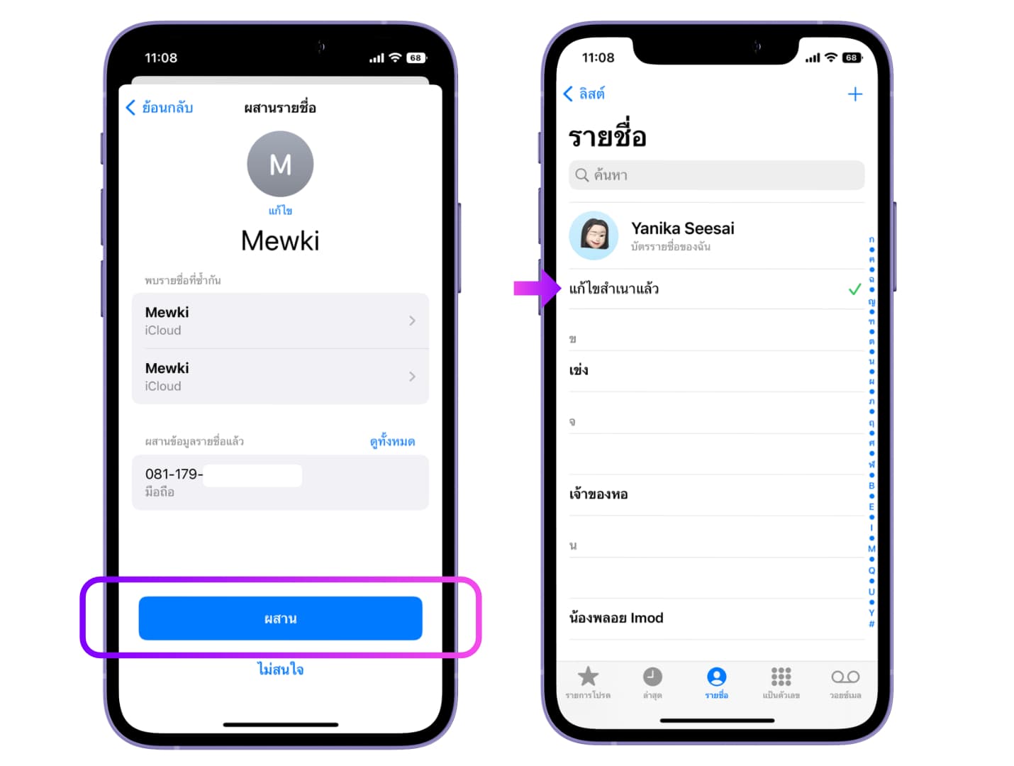 หากอยากผสานรายชื่อผู้ติดต่อให้เหลือเพียงอันเดียวให้แตะที่ “ผสาน”