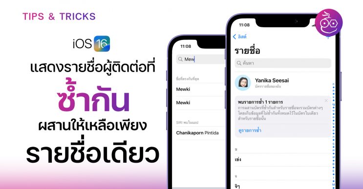 ในแอปรายชื่อ (Contacts) ที่อยู่ใน iOS 16 จะมีฟีเจอร์ที่ช่วยแก้ปัญหาการบันทึกรายชื่อผู้ติดต่อซ้ำกัน โดยตรวจสอบจากชื่อและจะแจ้งให้เราทราบหากพบรายชื่อที่ซ้ำกัน จากนั้นจะมีตัวเลือกให้เราผสานรายชื่อให้เหลือเพียงอันเดียว มาดูวิธีกันเลย