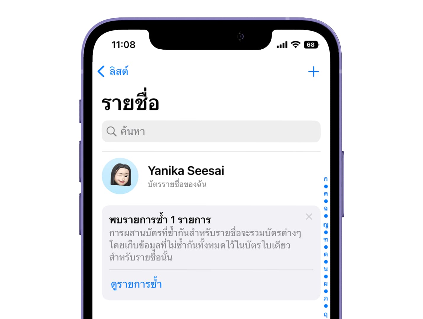 ใน iOS 16 หากเรามีรายชื่อผู้ติดต่อที่ซ้ำกันจะมีการแจ้งเตือนให้ทราบบริเวณด้านบนสุดของลิสต์รายชื่อ