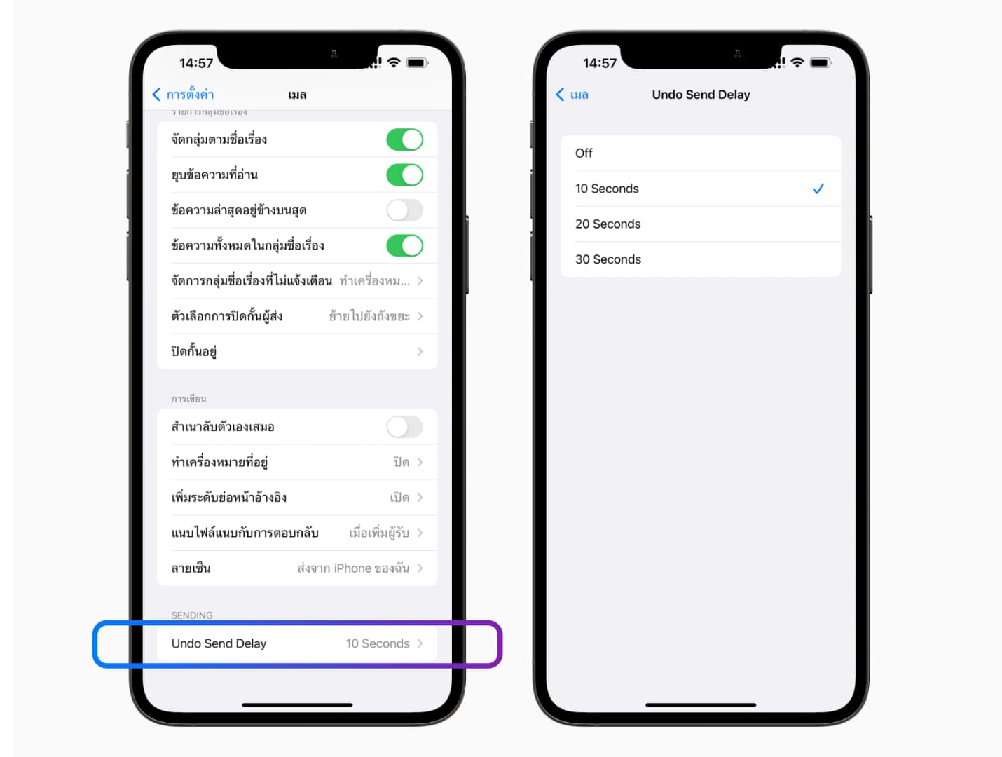 การตั้งค่า > เมล > เลื่อนลงมาล่างสุด จะพบกับคำว่า “Undo Send Delay” เมื่อแตะเข้าไปก็เลือกเวลาดีเลย์ที่ต้องการได้เลย