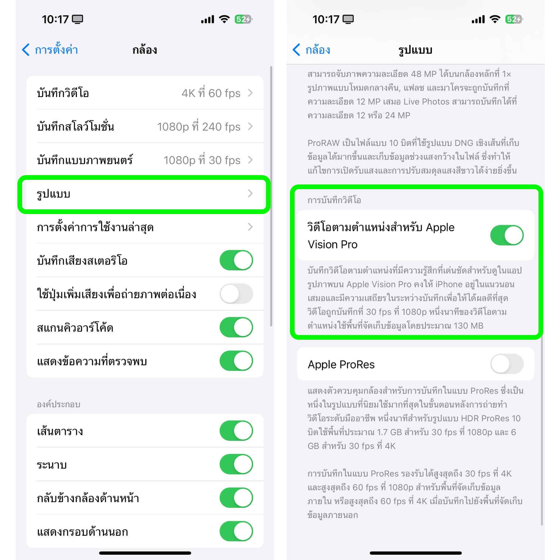 ไปที่แอปการตั้งค่า > กล้อง > เปิด “วิดีโอตามตำแหน่งสำหรับ Apple Vision Pro”
