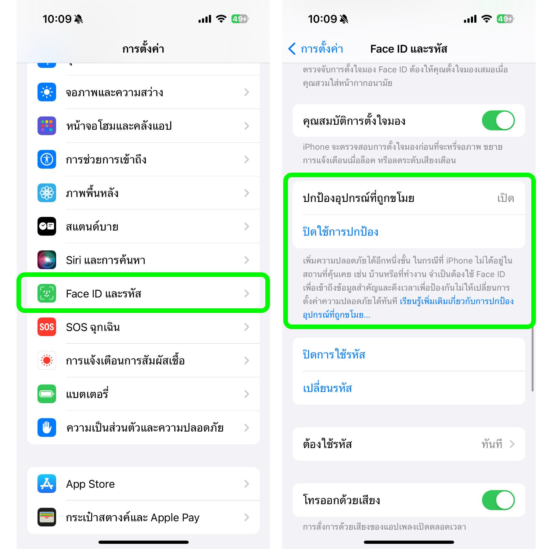 เข้าไปที่ การตั้งค่า > Face ID และรหัสผ่าน > เปิด “ปกป้องอุปกรณ์ที่ถูกขโมย”