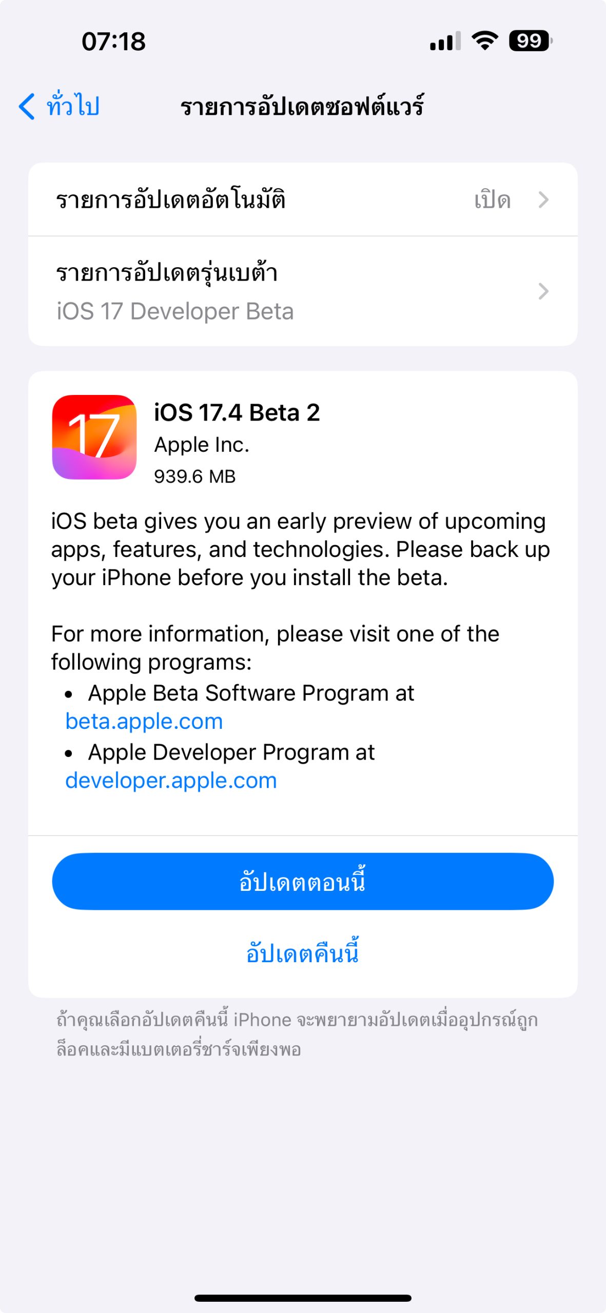 นักพัฒนาที่ลงทะเบียนทดสอบ iOS 17 Beta ไว้ สามารถอัปเดตเป็น iOS 17.4 Beta 2 ได้ที่ Software Update