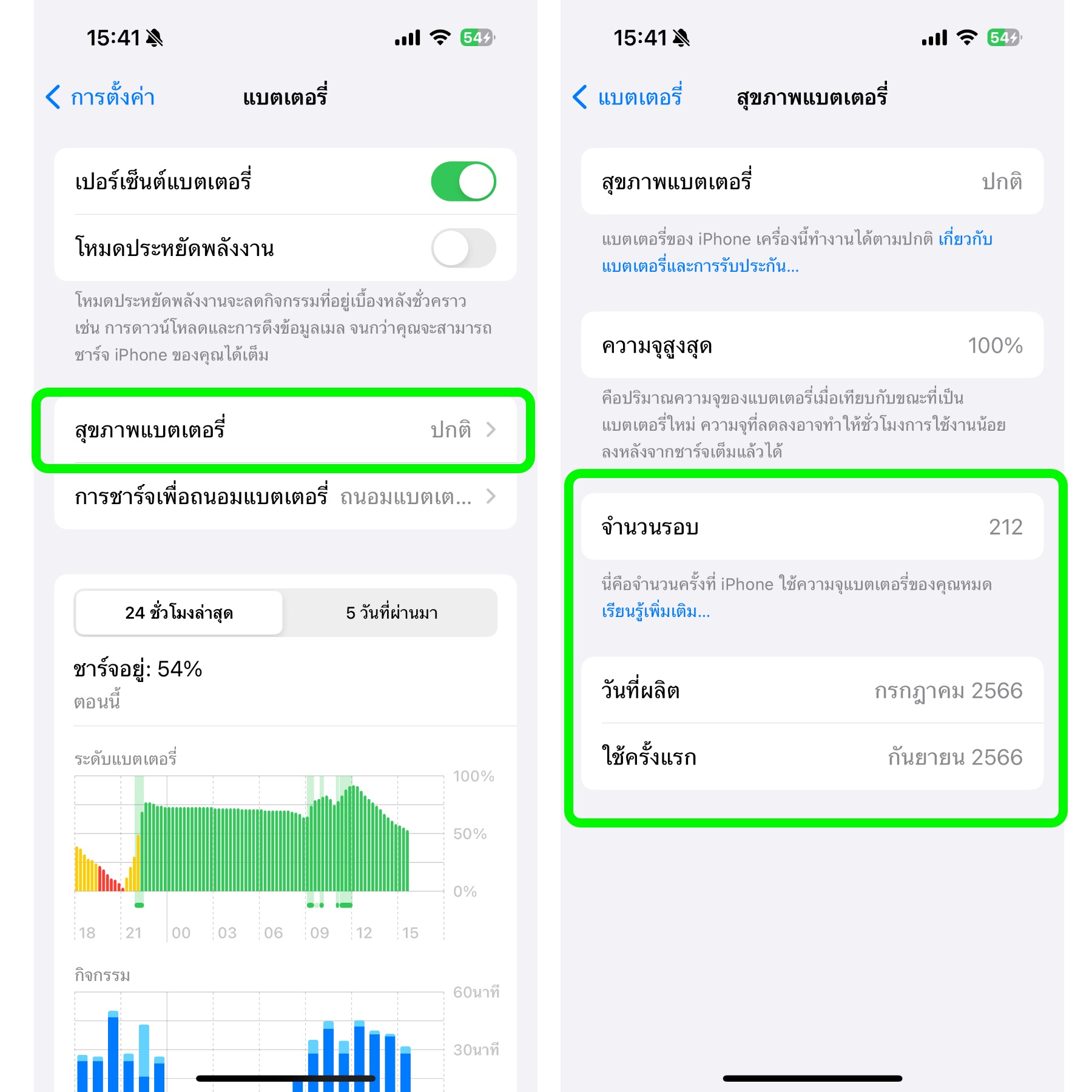 มีการย้ายเมนูรอบการใช้แบต วันที่ผลิตและวันใช้แบตครั้งแรกของ iPhone 15 Series ไปไว้ที่ การตั้งค่า > แบตเตอรี่ > สุขภาพแบตเตอรี่