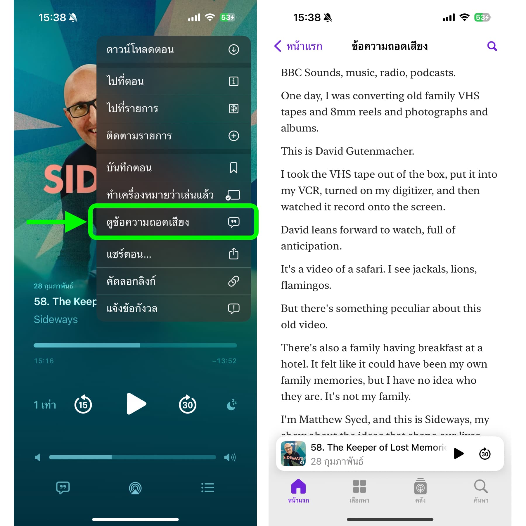แตะที่จุดสามจุด > แล้วเลือกใช้เมนู “ดูข้อความถอดเสียง”