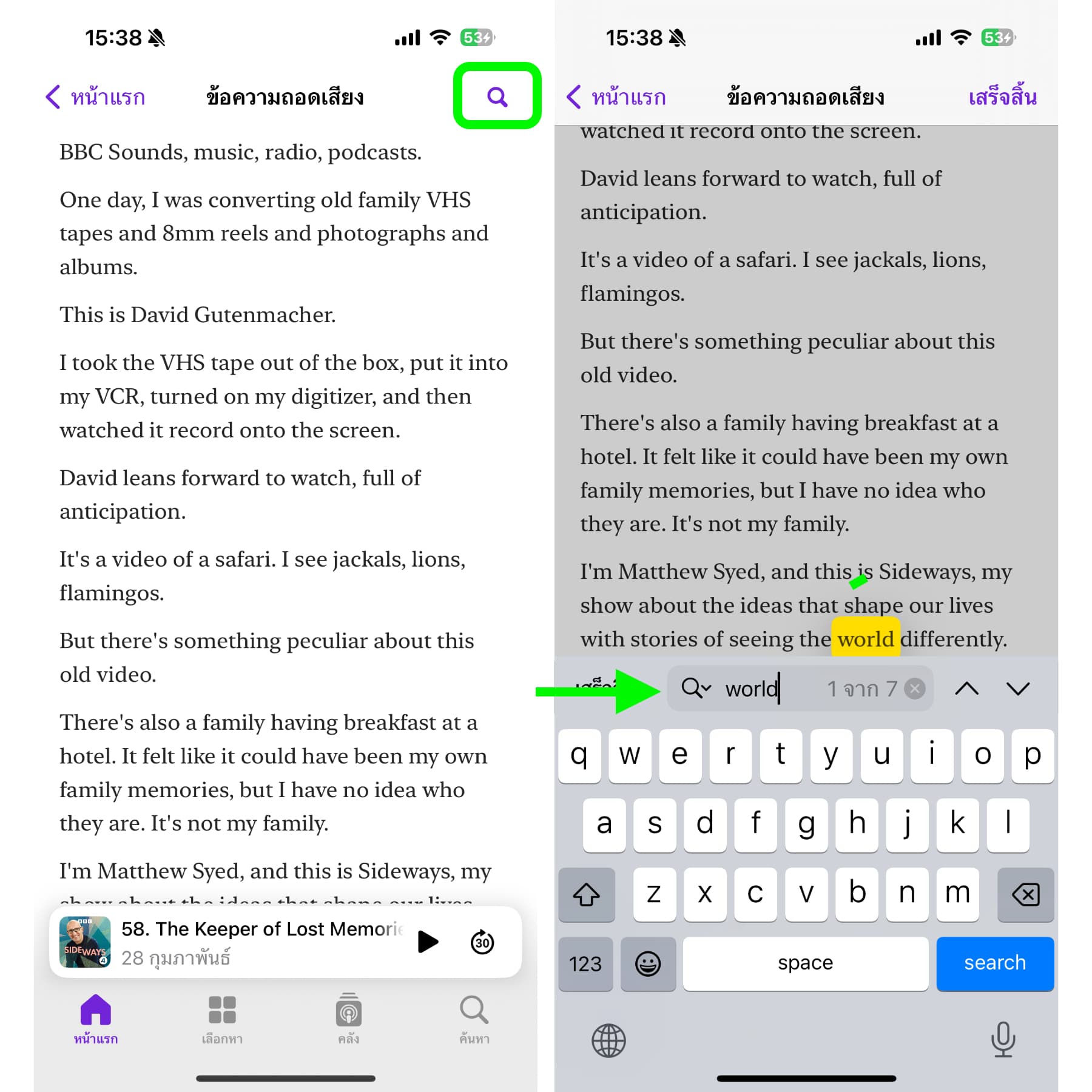 - ค้นหาคำใน transcript โดยการแตะที่ปุ่มแว่นขยาย จากนั้นก็พิมพ์คำที่ต้องการค้นหาลงไปได้เลย