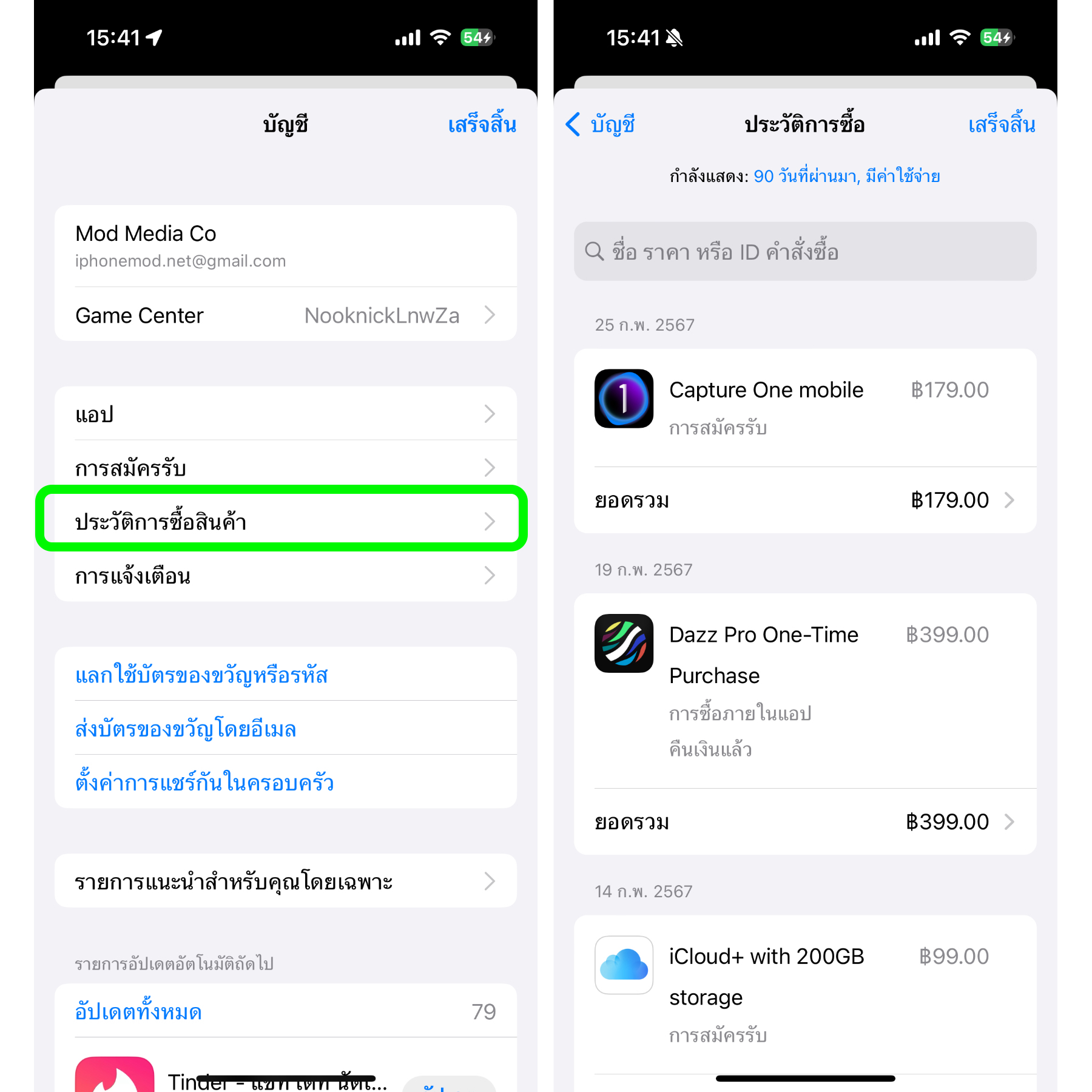 เข้าไปที่ App Store > แตะที่รูปโปร์ไฟล์มุมบนขวา > ประวัติการซื้อ