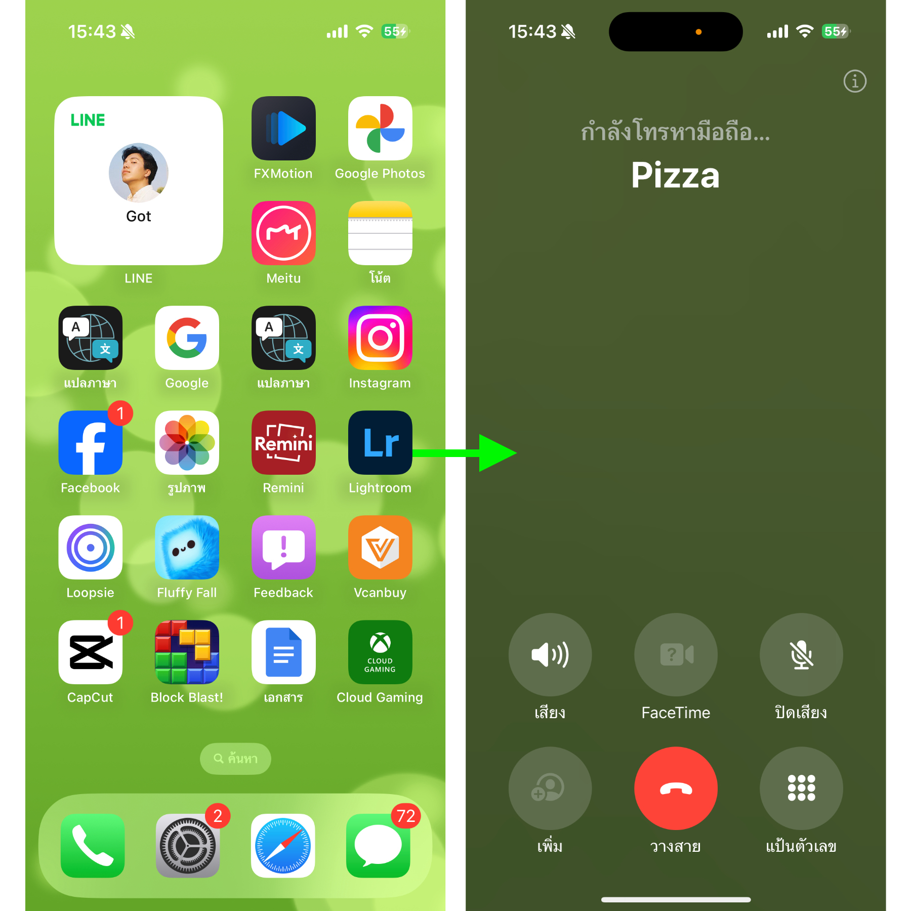 หากภาพพื้นหลังหน้าจอโฮมของเราเป็นสีเขียว ในหน้าการโทรก็จะเป็นสีเขียวไปด้วย