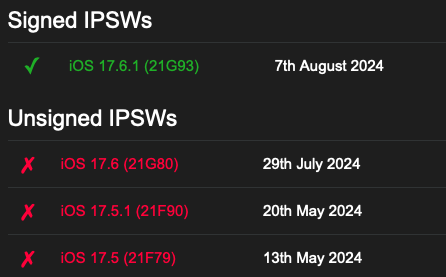 Apple ปิดไม่ให้ดาวน์เกรดกลับไป iOS 17.6 ทำให้ผู้ใช้ที่อัปเดตเป็น iOS 17.6.1 ไปแล้วจะไม่สามารถดาวน์เกรดกลับไปติดตั้ง iOS 17.6 ได้อีกต่อไป