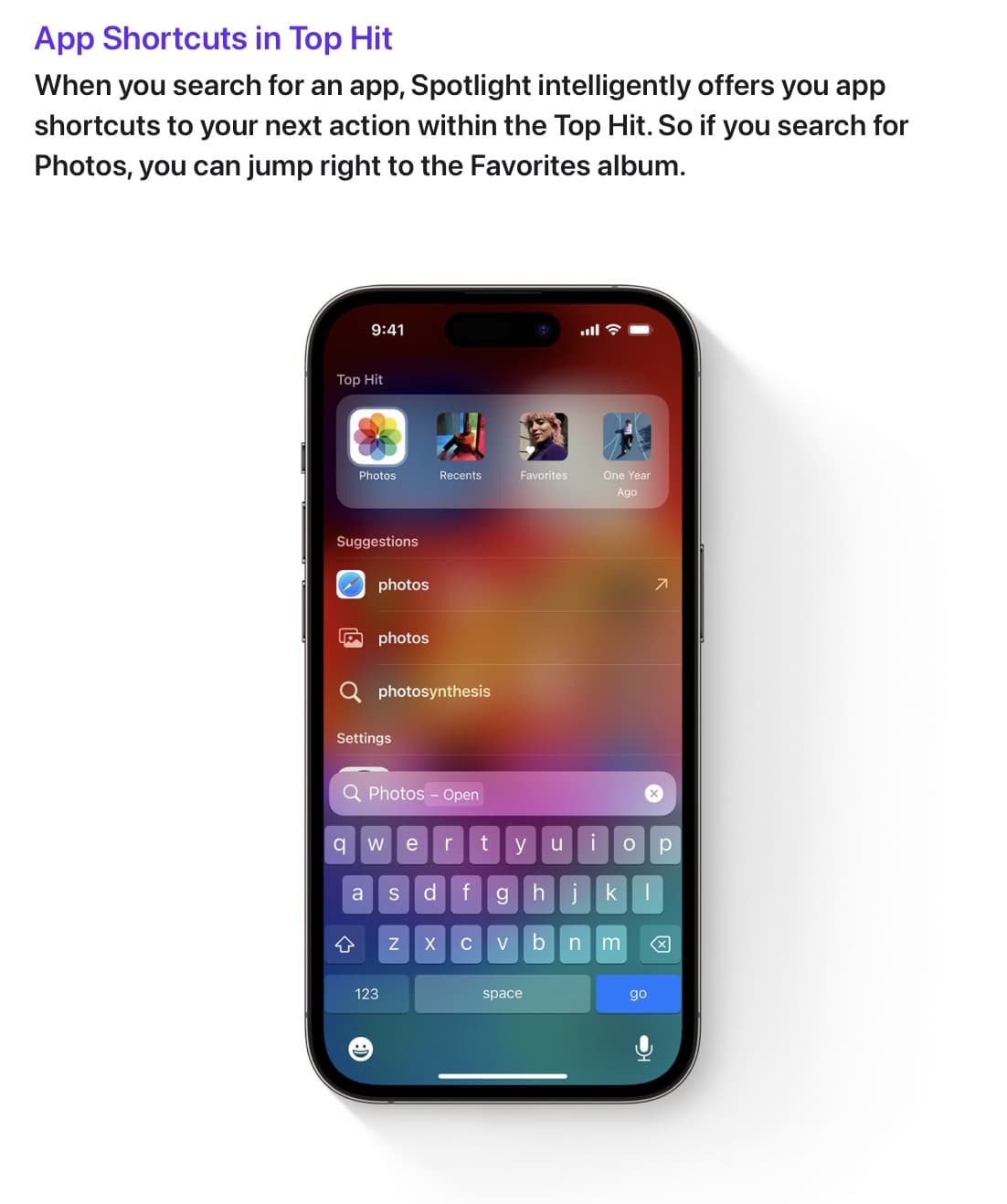 เมนูยอดนิยม (Top Hits)ใน Spotlight Search แสดงผลลัพธ์ตามคำที่ค้นหาได้แม่นยำมากขึ้น โดยจะแสดงแอปหรือคำค้นหาที่เรามักใช้งานบ่อย ๆ ขึ้นมาก่อน