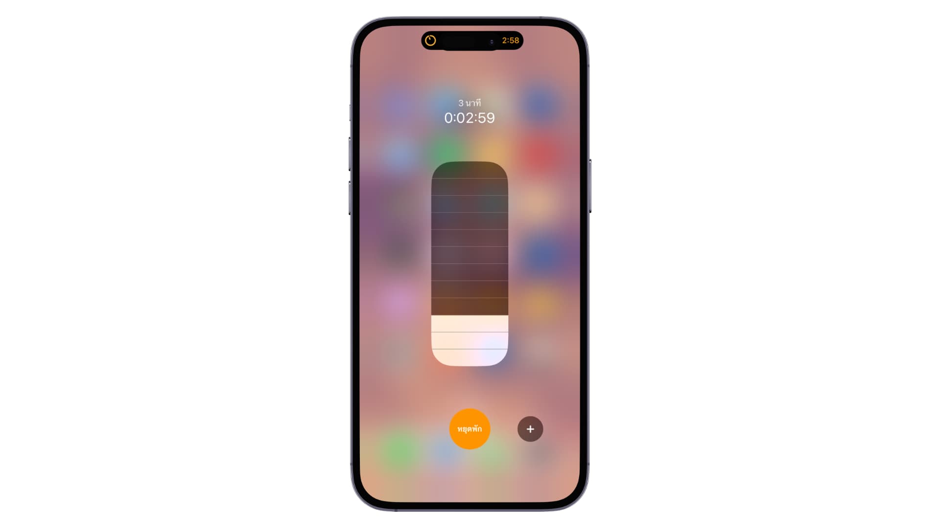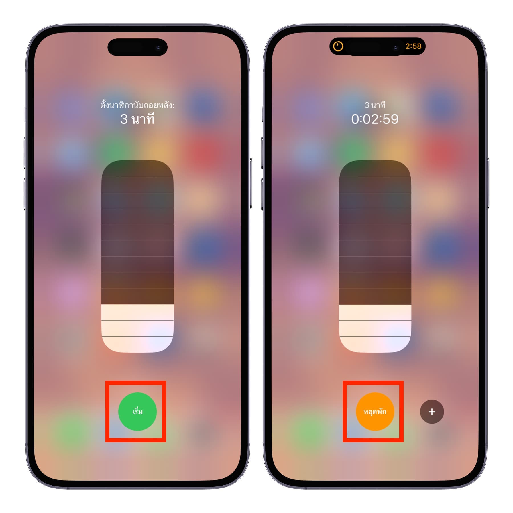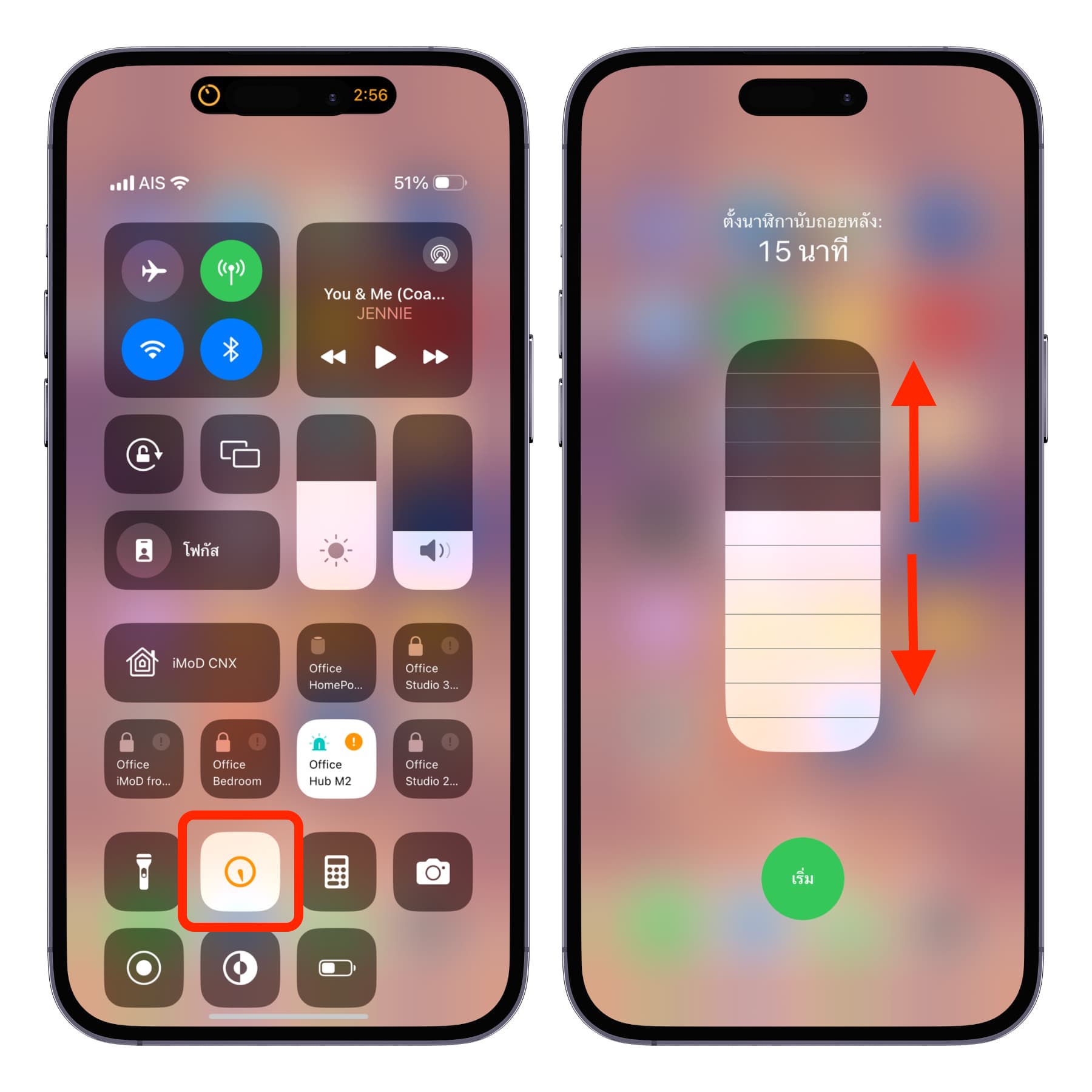 ปัด Control Certer ลงมา จากนั้นแตะค้างที่ไอคอนนาฬิกานับถอยหลัง จากนั้นปัดขึ้นปัดลงเพื่อเลือกระยะเวลาการนับถอยหลัง ตั้งได้ตั้งแต่ 1 นาที จนถึง 2 ชั่วโมง จากนั้นก็แตะปุ่มสีเขียวเพื่อเริ่มการนับถอยหลังได้เลย