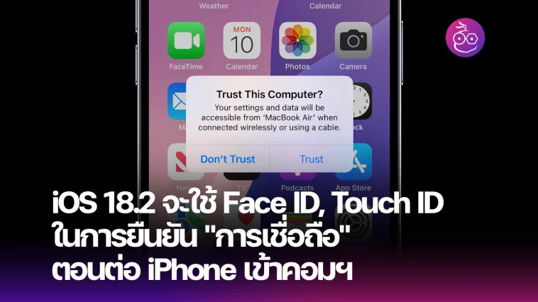 สำหรับการยืนยันการเชื่อถือตอนต่อ iPhone เข้ากับ Mac/PC, ใน iOS 18.2 จะใช้การยืนยันด้วย Face ID, Touch ID แทนการกรอก Passcode แบบเดิม