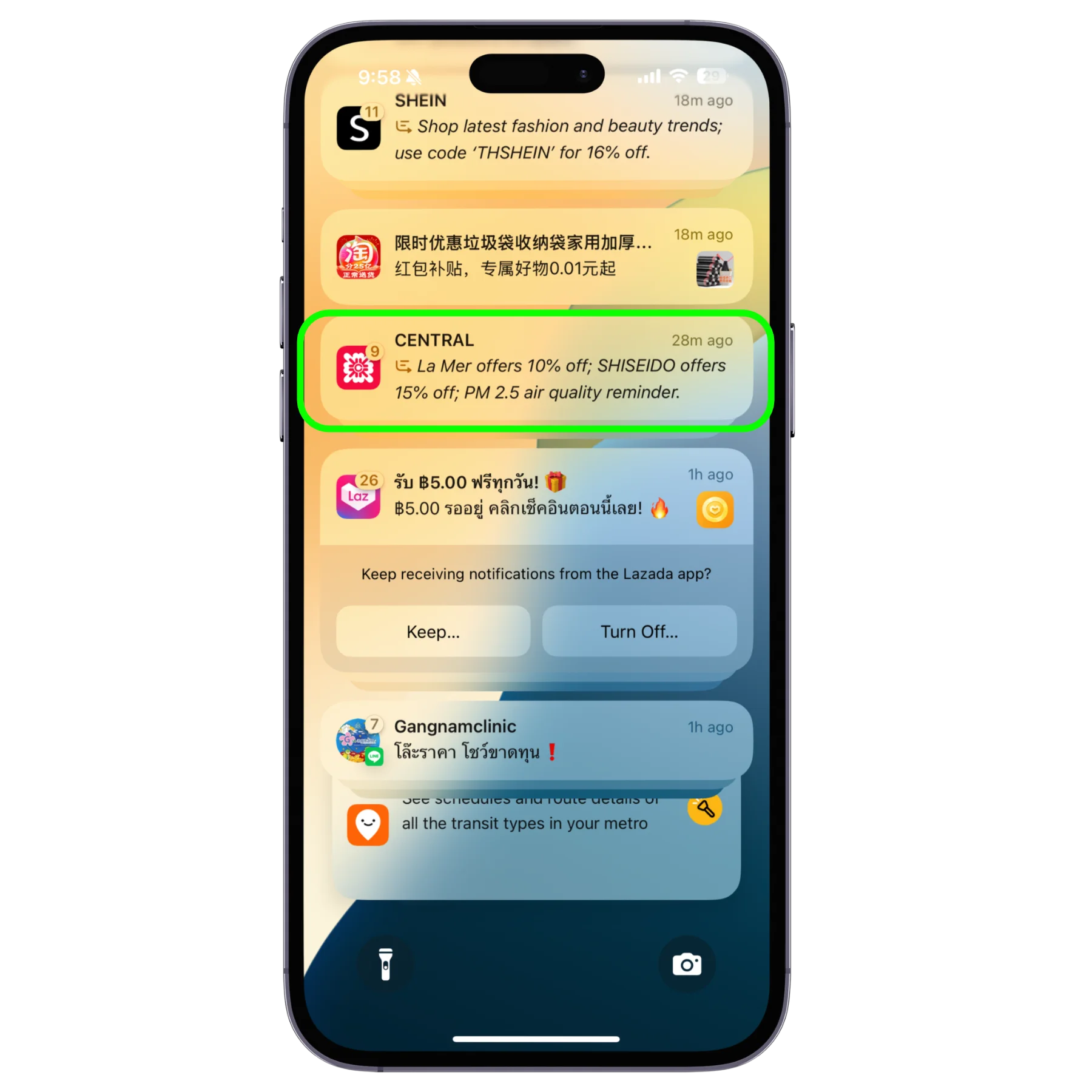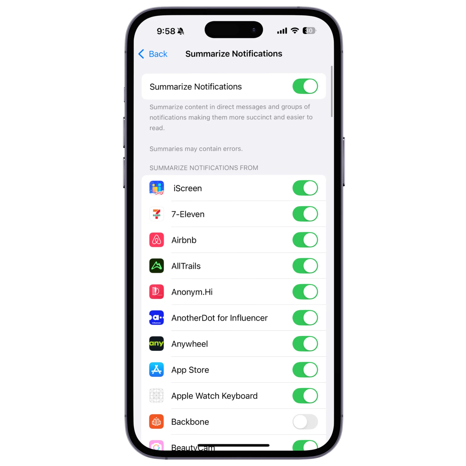 ผู้ใช้สำหรับ iPhone 15 Pro, iPhone 15 Pro Max และ iPhone 16 ทุกรุ่น สามารถจัดการการตั้งค่าสรุปการแจ้งเตือนบนหน้าจอล็อคได้ โดยเลือกว่าจะให้แอปไหนสรุปการแจ้งเตือนให้บ้าง