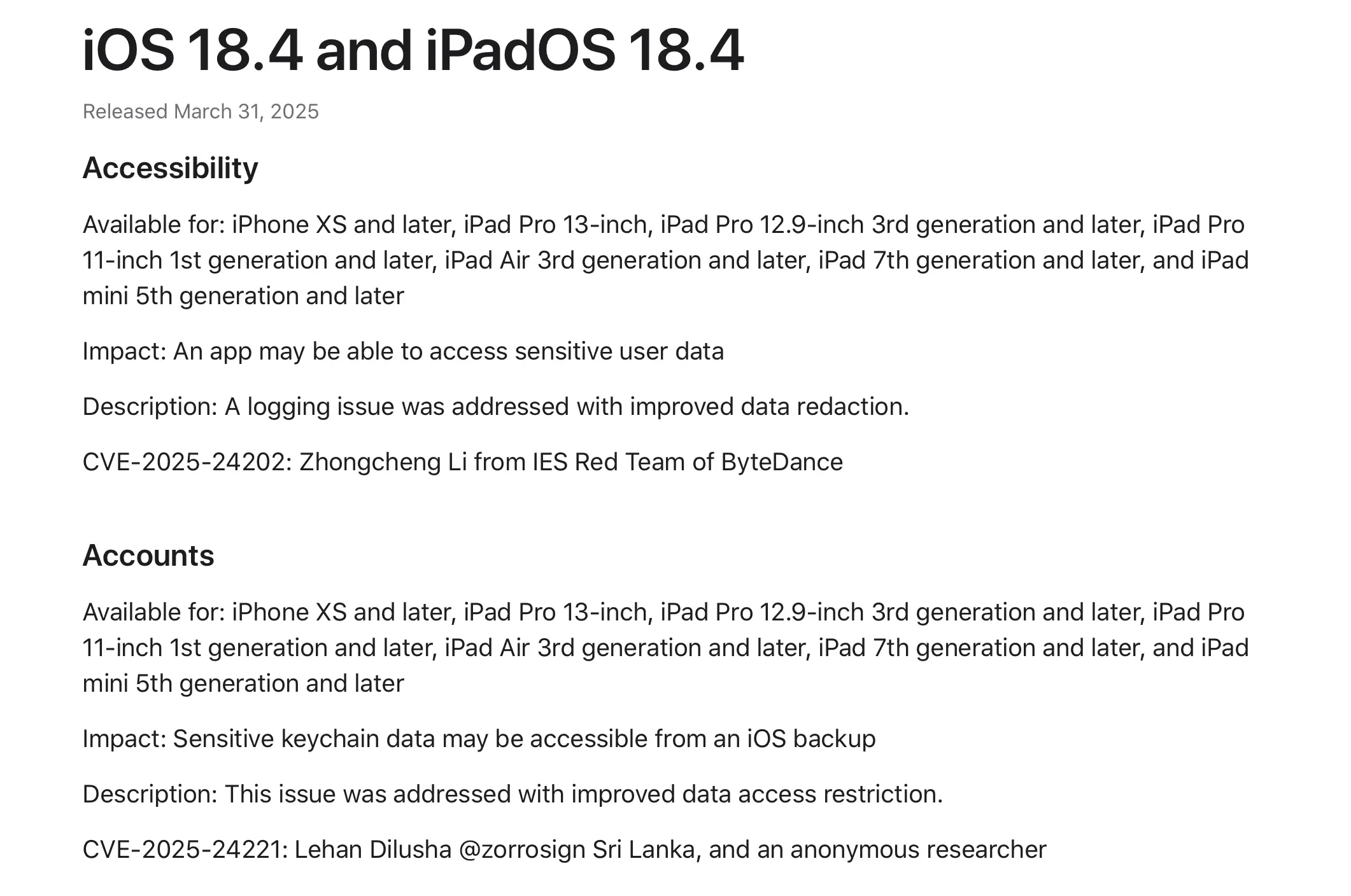 เว็บไซต์ Apple ระบุว่า iOS 18.4, iPadOS 18.4 และ macOS 15.4 อุดช่องโหว่ความปลอดภัยเกือบ 60 รายการ เช่น ช่องโหว่ที่จะทำให้ผู้ไม่หวังดีเข้าถึงข้อมูล Keychain แล้วจะนำไปใช้เพื่อเข้าถึงข้อมูลสำรองของ iOS ได้, การกรอกรหัสผ่านอัตโนมัติ แม้จะตรวจสอบสิทธิ์ไม่สำเร็จ, Bug ที่จะทำให้ดูรูปภาพที่ซ่อนไว้ได้โดยไม่ต้องตรวจสอบสิทธิ์