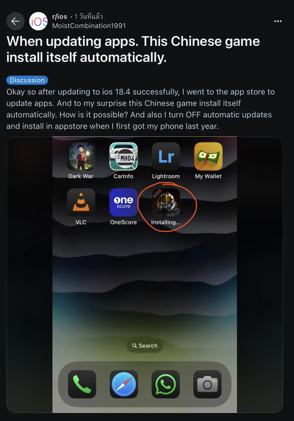 ผู้ใช้ iPhone ที่อัปเดตเป็น iOS 18.4 หลายรายได้รายงานผ่านทั้งในกระทู้ Reddit (1,2,3,4) และ เว็บไซต์ Apple Support ว่า ในช่วง 24 ชั่วโมงหลังอัปเดตเป็น iOS 18.4 พบว่า มีแอป, เกม ถูกดาวน์โหลดและติดตั้งบน iPhone ของตัวเอง ทั้ง ๆ ที่ไม่เคยโหลดมาก่อน