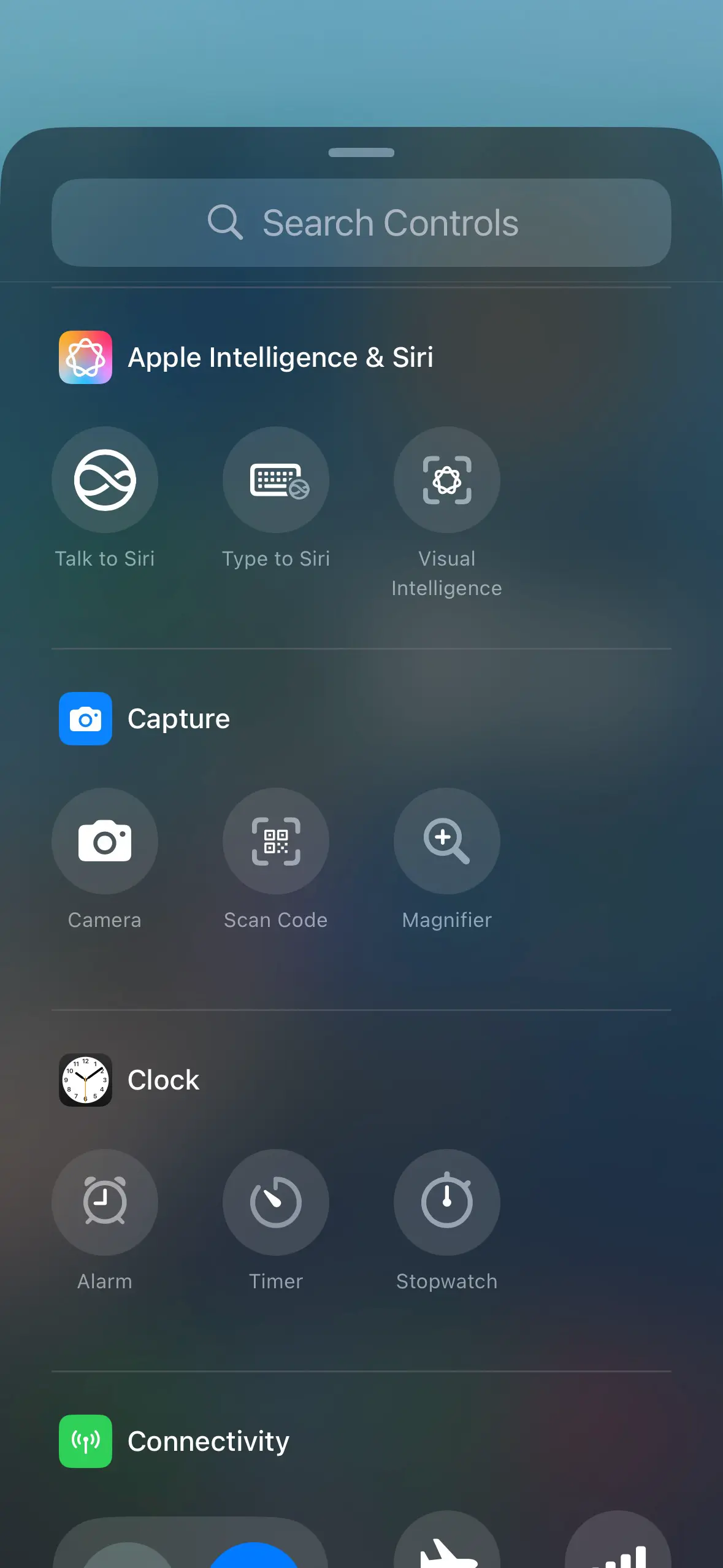 ผู้ใช้สามารถเพิ่มส่วนควบคุมของ Apple Intelligence ใน Control Center ได้ เช่น Talk to Siri, Type to Siri และ Visual Intelligence เป็นต้น
