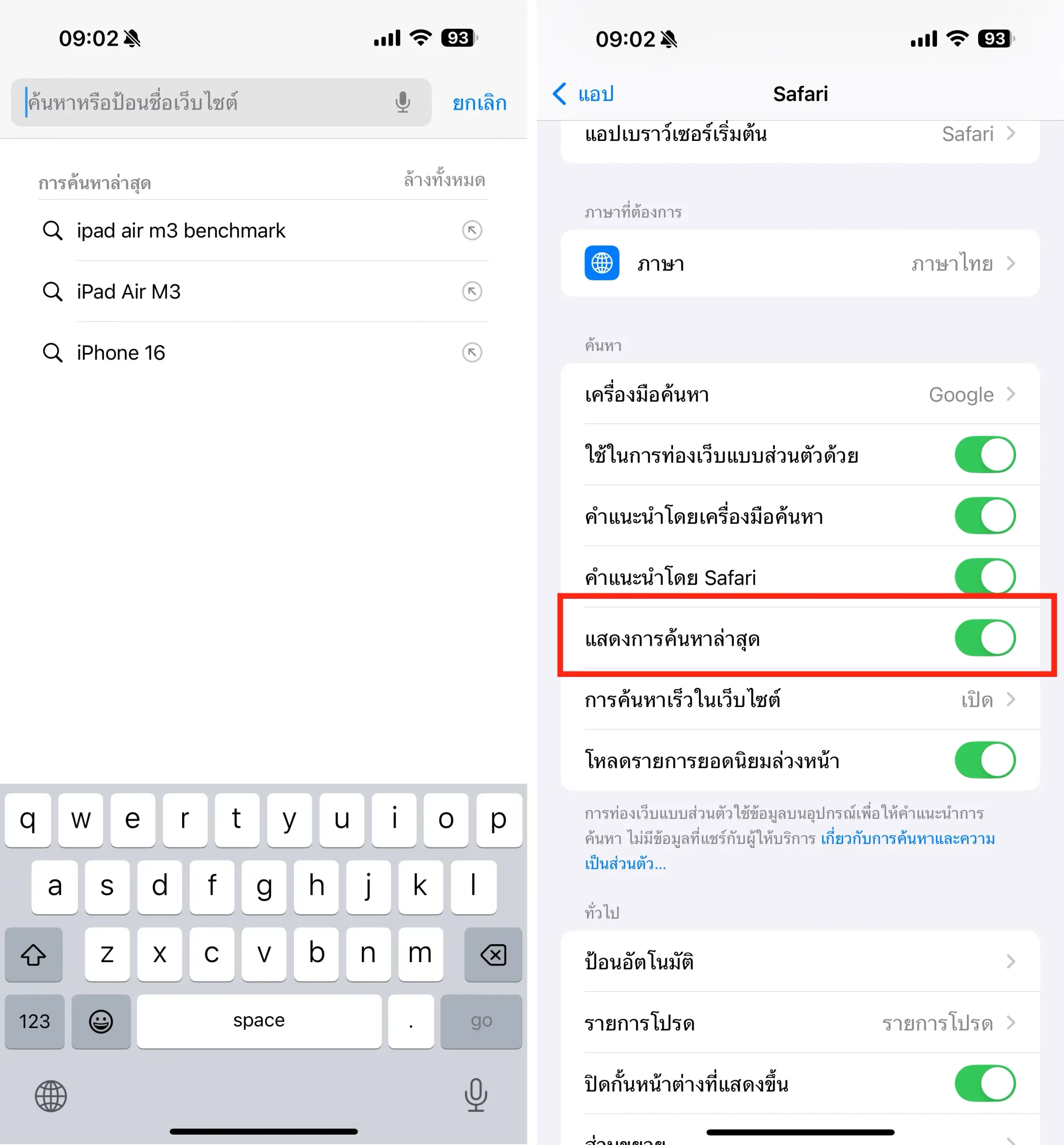 ตั้งค่าแสดง/ไม่แสดง การค้นหาล่าสุดได้