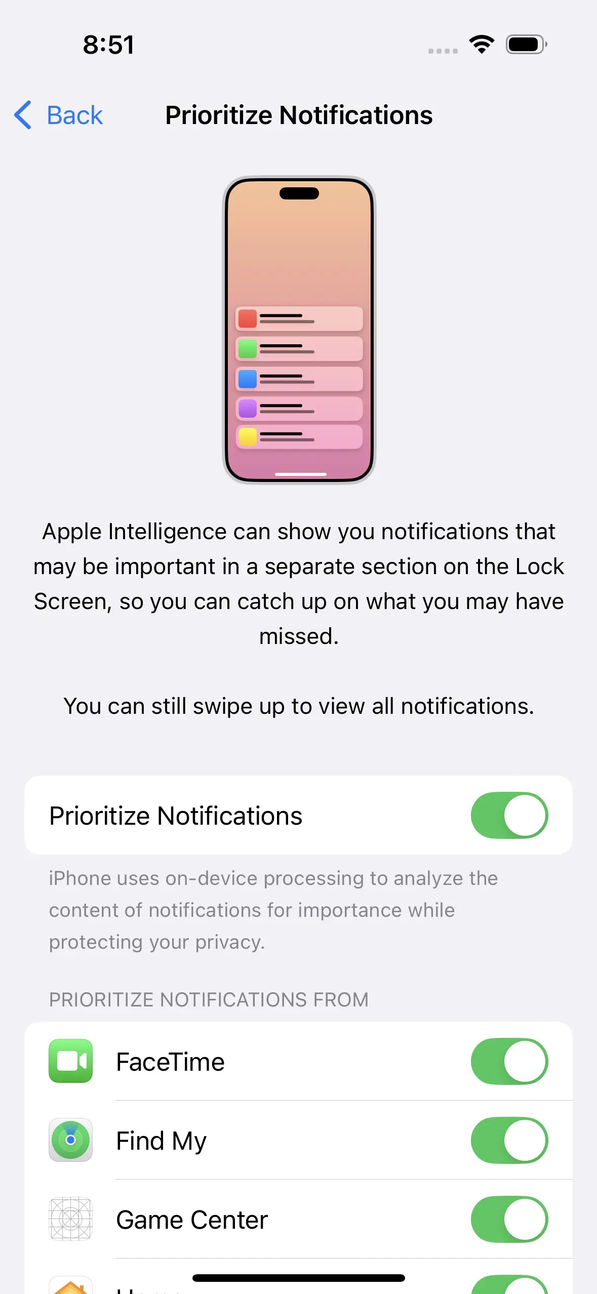 Priority Notification แบบใหม่นี้ Apple Intelligence จะลำดับแสดงการแจ้งเตือนที่สำคัญมาแสดงให้กับผู้ใช้ก่อน ผู้ใช้สามารถตั้งค่าการแจ้งเตือนแต่ละแอปได้ ไม่จำเป็นต้องเปิด ปิด ทั้งหมด โดย Prioritize Notifications นั้นจะแยกการแจ้งเตือนออกมา เพื่อให้เห็นการแจ้งเตือนที่สำคัญก่อน