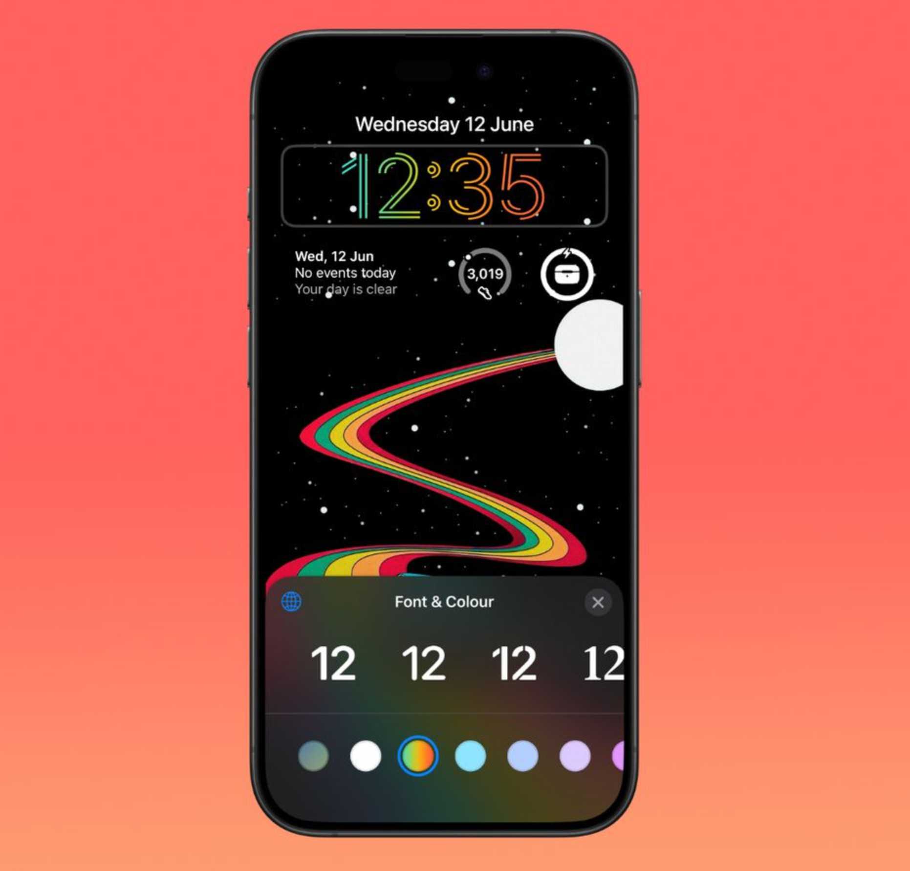 ใน iOS 18, Apple ได้เพิ่มตัวเลือกสีของแบบอักษร “แบบหลายสี” ในการตั้งค่าแบบอักษรและสีของนาฬิกาในหน้าจอล็อค ซึ่งหากผู้ใช้ตั้งค่าภาพพื้นหลังหน้าจอล็อคให้เป็นสีรุ้ง, ก็สามารถตั้งค่าแบบอักษรที่นาฬิกาเป็นสีรุ้งตามภาพพื้นหลังได้