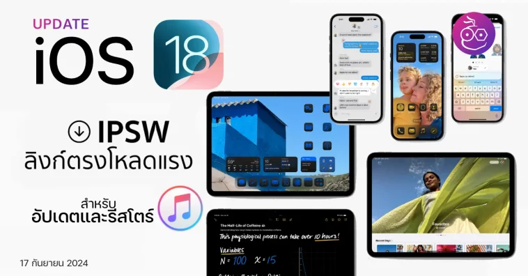 17 กันยายน 2567 ทาง Apple ได้ปล่อย iOS 18, iPadOS 18 ให้อัปเดตกันแล้ว สำหรับใครที่ต้องการอัปเดตผ่านคอมพิวเตอร์ สามารถดาวน์โหลดลิงก์ IPSW ได้ที่นี่