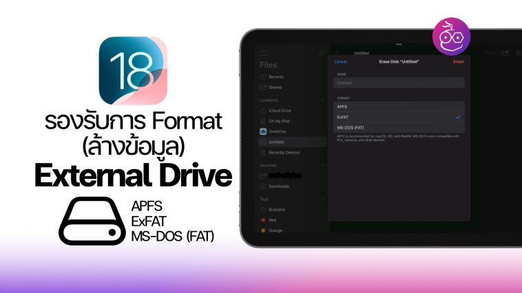 MacRumors เผยข้อมูลอ้างอิงจากโพสต์ของ ByteBits, Kaleb Cadle ว่า หลังจากที่ผู้ใช้เชื่อมต่อ External Drive เข้ากับ iPhone (iOS 18), iPad (iPadOS 18) แล้ว ในแอป Files จะมีตัวเลือก External Drive อยู่ที่เมนูด้านข้าง และผู้ใช้สามารถแตะชื่อ Drive เพื่อ Format ข้อมูลได้ (Erase)