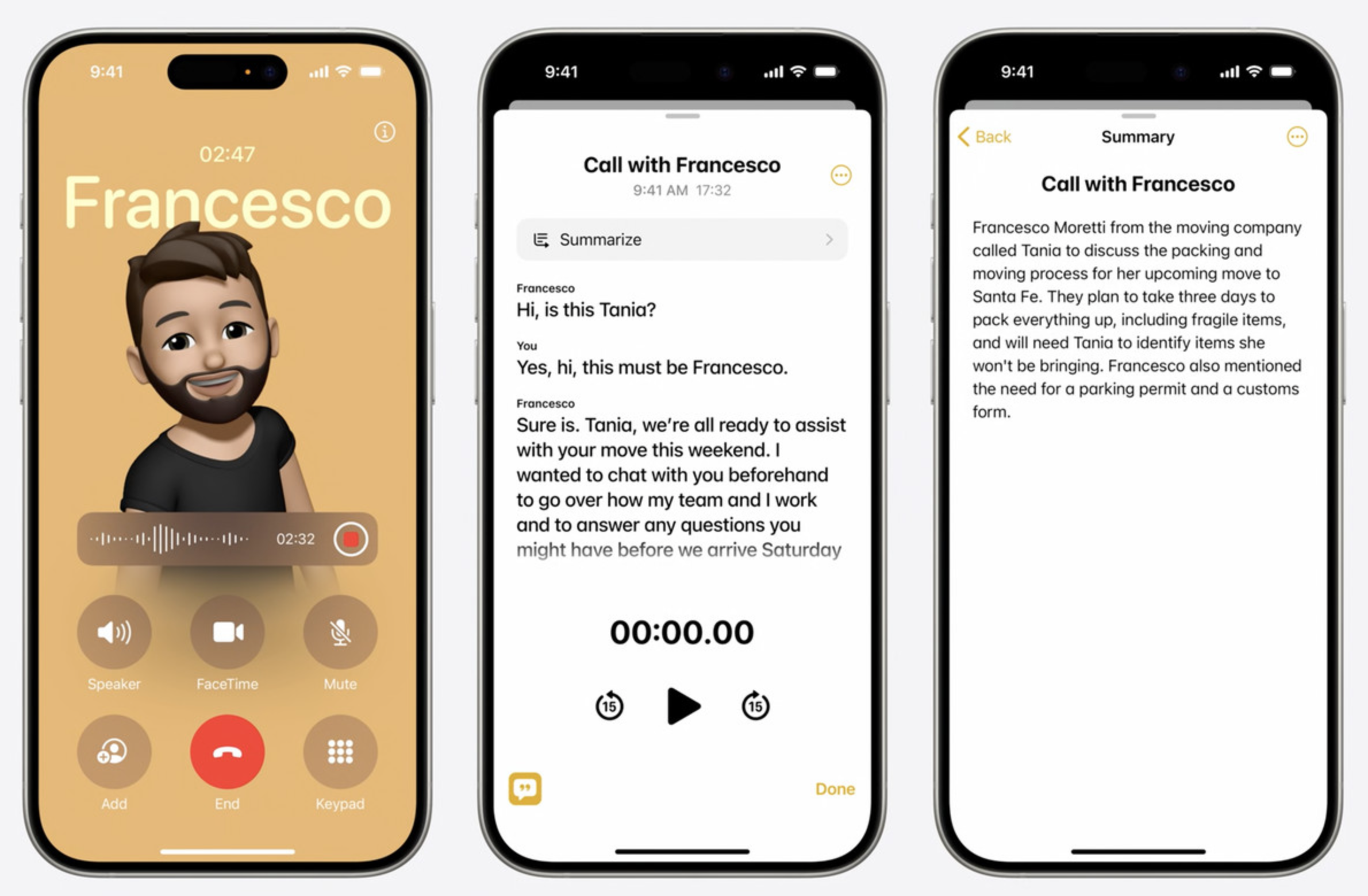 หลังจากการสนทนา หรือบันทึกเสียงเสร็จสิ้น ผู้ใช้สามารถให้ระบบทำการถอดเสียงสนทนาออกมาเป็นข้อความได้ และด้วยคุณสมบัติของ Apple Intelligence, ระบบสามารถสรุปประเด็นสำคัญการการสนทนาได้ ผู้ใช้สามารถเลือกกลับไปดูประเด็นที่สำคัญได้ด้วย