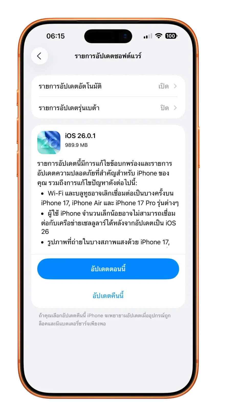 ผู้ใช้ iPhone รุ่นรองรับ สามารถกดอัปเดตเป็น iOS 26.0.1 ได้ โดยไปที่การตั้งค่า > รายการอัปเดตซอฟต์แวร์ จากนั้นกดอัปเดตได้เลย