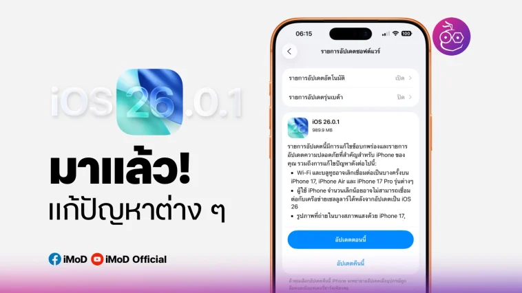 Apple ปล่อยอัปเดต iOS 26.0.1 แก้ปัญหาหลายอย่างจากเวอร์ชันก่อนหน้า โดยเฉพาะปัญหาที่เกิดขึ้นกับ iPhone 17 Series เช่น ถ่ายรูปติดวัตถุแปลก ๆ, เชื่อมต่อ Wi-Fi ไม่ได้ และอื่น ๆ