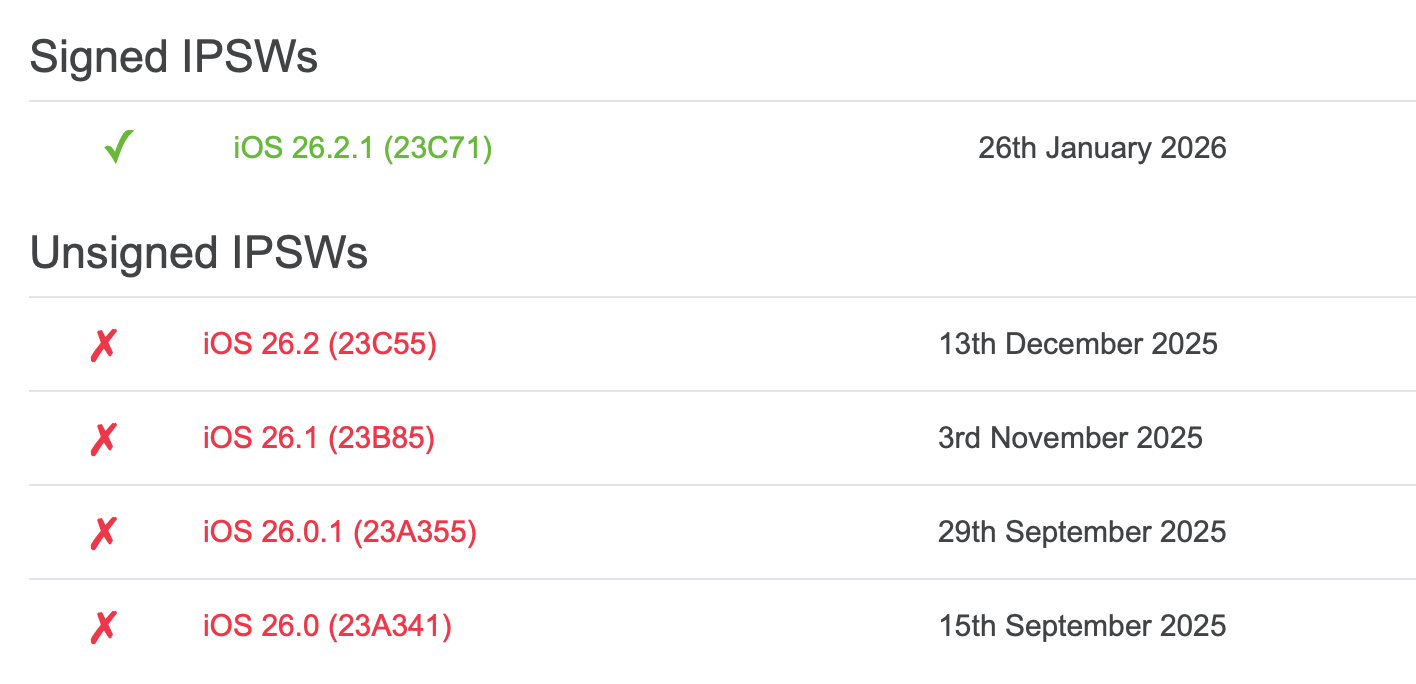 Apple ปิดไม่ให้ดาวน์เกรดกลับไป iOS 26.2 ทำให้ผู้ใช้ที่อัปเดตเป็น iOS 26.2.1 ไปแล้ว จะไม่สามารถดาวน์เกรดกลับไปติดตั้ง iOS 26.2 ได้อีกต่อไป