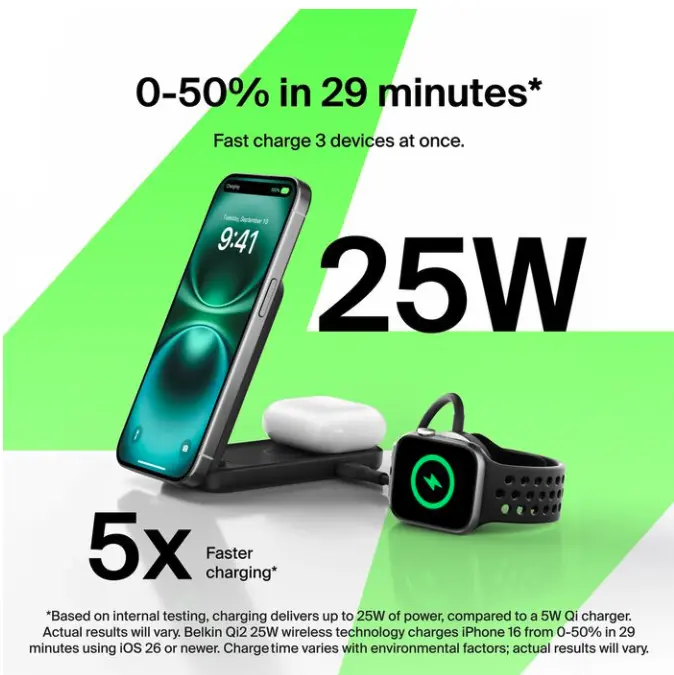 Belkin ระบุว่าที่ชาร์จใหม่ทั้ง 3 รุ่นนั้นสามารถชาร์จ iPhone 16 ที่ติดตั้ง iOS 26 จาก 0% ถึง 50% ในเวลาประมาณ 30 นาที ซึ่งเป็นเวลาเดียวกับที่ Apple โฆษณาสำหรับ 25W MagSafe Charger เมื่อใช้กับ iPhone 16 และข้อความนี้ก็สามารถใช้ยืนยันได้ว่า iOS 26 ได้เพิ่มการรองรับ Qi 2.2 ให้กับ iPhone 16 Series