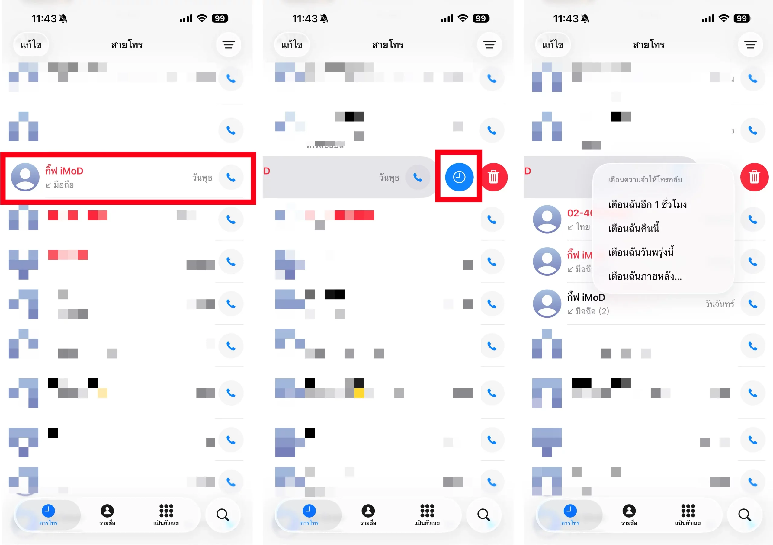 หลังจากตั้งค่าการเตือนความจำให้โทรกลับแล้ว รายการจะแสดงอยู่ที่ด้านบนสุด ผู้ใช้สามารถตั้งค่าเพิ่มเติม หรือกดลบออกได้