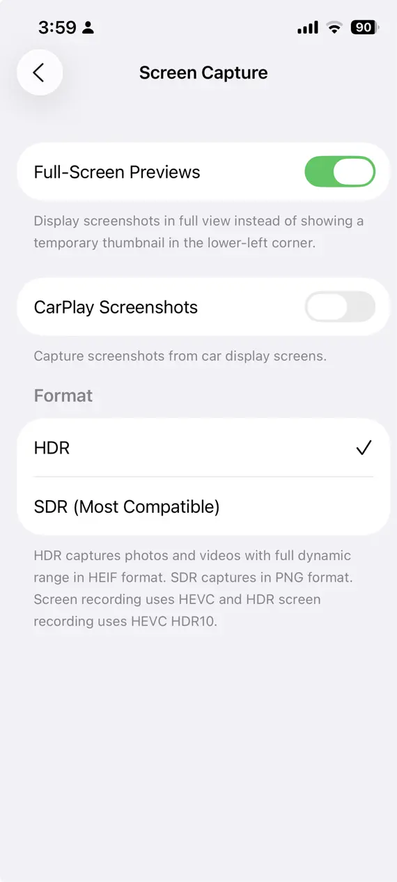 ในการตั้งค่า ได้เพิ่มเมนูใหม่ที่มีชื่อว่า Screen Capture ซึ่งเราสามารถเลือกประเภทการจับภาหน้าจอได้ระหว่าง HDR และ SDR ฟีเจอร์นี้ ช่วยให้เวลาที่จับภาพหน้าจอจากวิดีโอแบบ HDR จะได้ผลลัพธ์สีที่ตรงขึ้น สามารถอ่านรายละเอียดเพิ่มเติมได้ที่นี่
