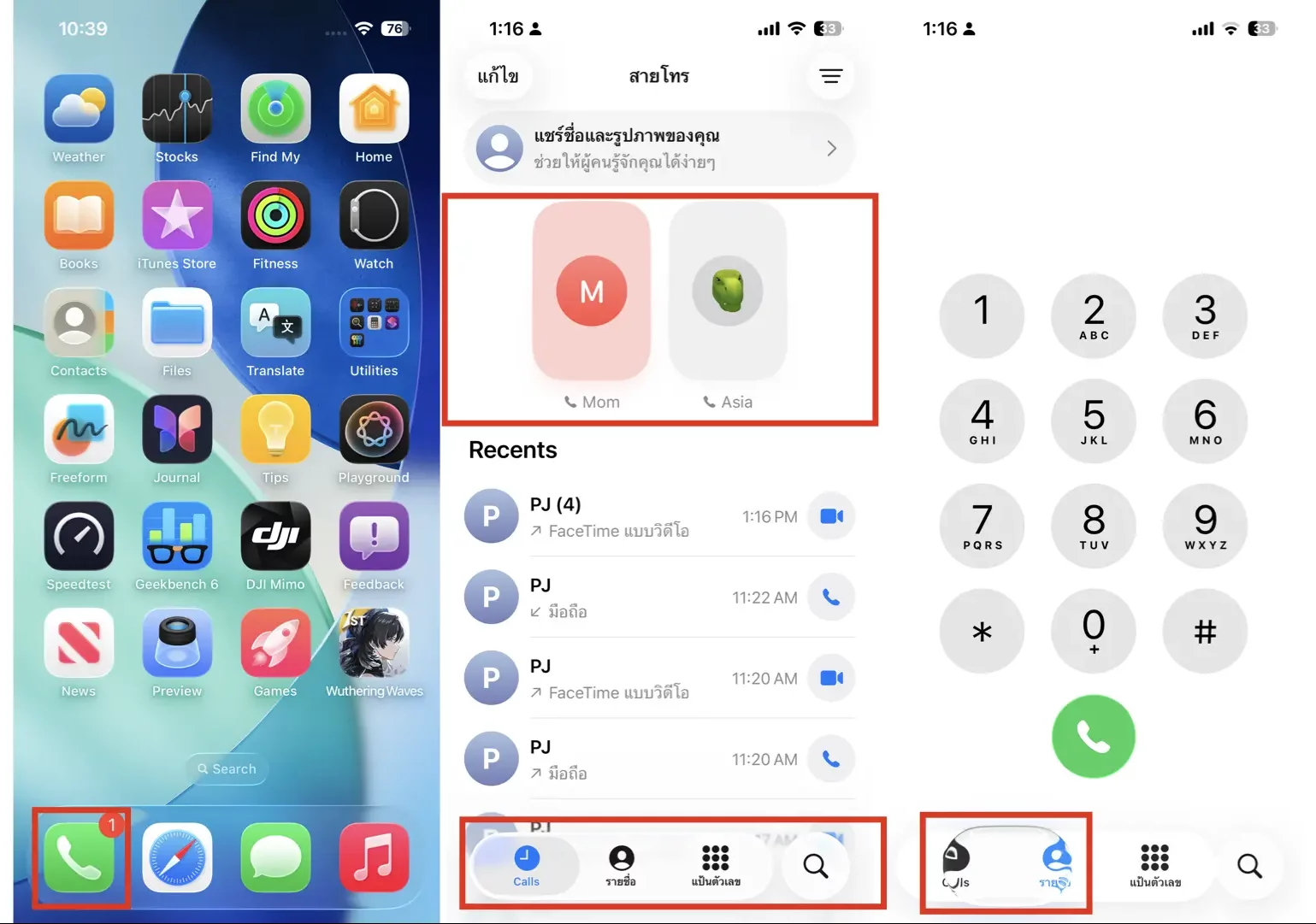 แอปการโทรบน iOS 26 มีการปรับไอคอนแอปให้มีความเป็นกระจกมากจึ้น หน้าการใช้งานของแอปการโทรก็มีการ้ชเปลี่ยนดีไซน์ใหม่ ดีไซน์รอบนี้มีความคลีนและเป็นระเบียบมากขึ้น เมนูด้่นล่าง ปรับใหม่ แหลือเพียง 3 เมนู ส่วนรายชื่อโปรด ถูกย้ายไปอยู่ด้านบนของหน้าแรก เพิ่มความสะดวกในการใช้งาน และเห็นรายชื่อโปรดได้ชัดมากขึ้น