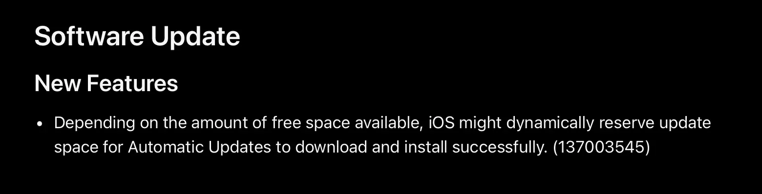 Apple ระบุในเอกสาร Release notes ของ iOS 26 Developer Beta ว่า “ขึ้นอยู่กับพื้นที่ว่างของตัวเครื่อง, iOS จะสำรองพื้นที่แบบ Dynamic เพื่อดาวน์โหลด และติดตั้งอัปเดตโดยอัตโนมัติจนกว่าจะเสร็จสิ้น”
